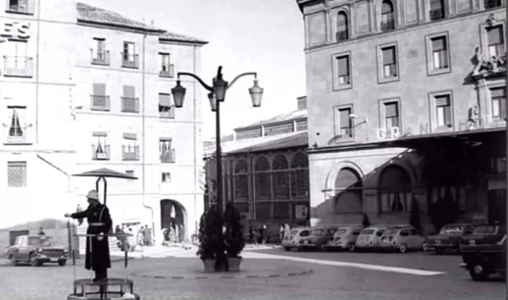 Las escenas que podemos ver en la imagen, datan de los años 50, y en ellas se observa a un guardia urbano de tráfico bajo una sombrilla.
