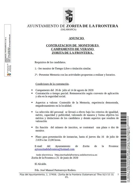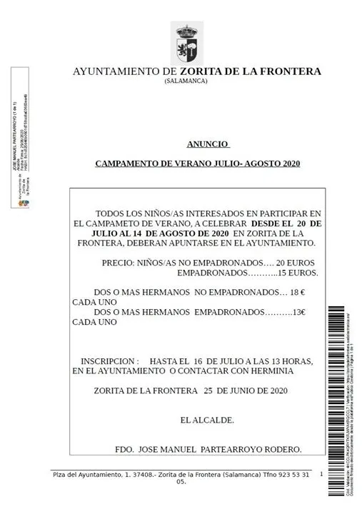 Este Consistorio ya publicó a finales de junio una oferta de empleo para un monitor, en la que pedía una memoria con propuestas de actividades a organizar por parte de los candidatos. Ahora José Manuel Partearroyo Rodero, alcalde de la localidad, firma un anuncio donde se dan a conocer las condiciones para la inscripción, así como los precios donde se ofrece una reducción de tarifa a empadronados y a la inscripción de más de dos o más hermanos, con el fin de facilitar la participación de estos jóvenes.
