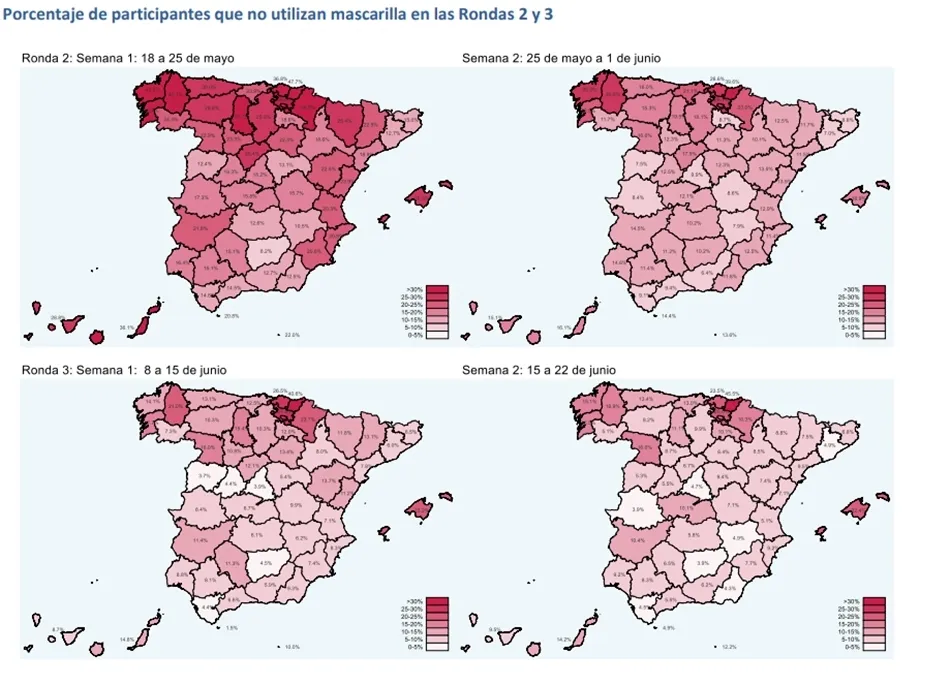 Mientras que a mediados de mayo (1ª semana Ronda 2), un 19,3% de la población mayor de 6 años no utilizaba nunca la mascarilla, a finales del mismo mes (2ª semana Ronda 2) esta proporción se redujo notablemente (11,3%). Durante la tercera ronda del estudio el porcentaje continuó descendiendo siendo del 8,4% y del 7,3% en las semanas del 8 al 15 de junio y del 15 al 22 de junio, respectivamente.