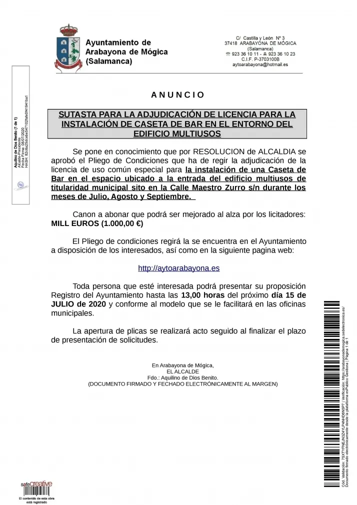 El Ayuntamiento de Arabayona ha publicado hoy un anuncio para dar a conocer la subasta para la adjudicación de licencia para la instalación de caseta de bar en el entorno del edificio multiusos. El canón de 1.000 euros a abonar podrá ser mejorado al alza por los licitadores.