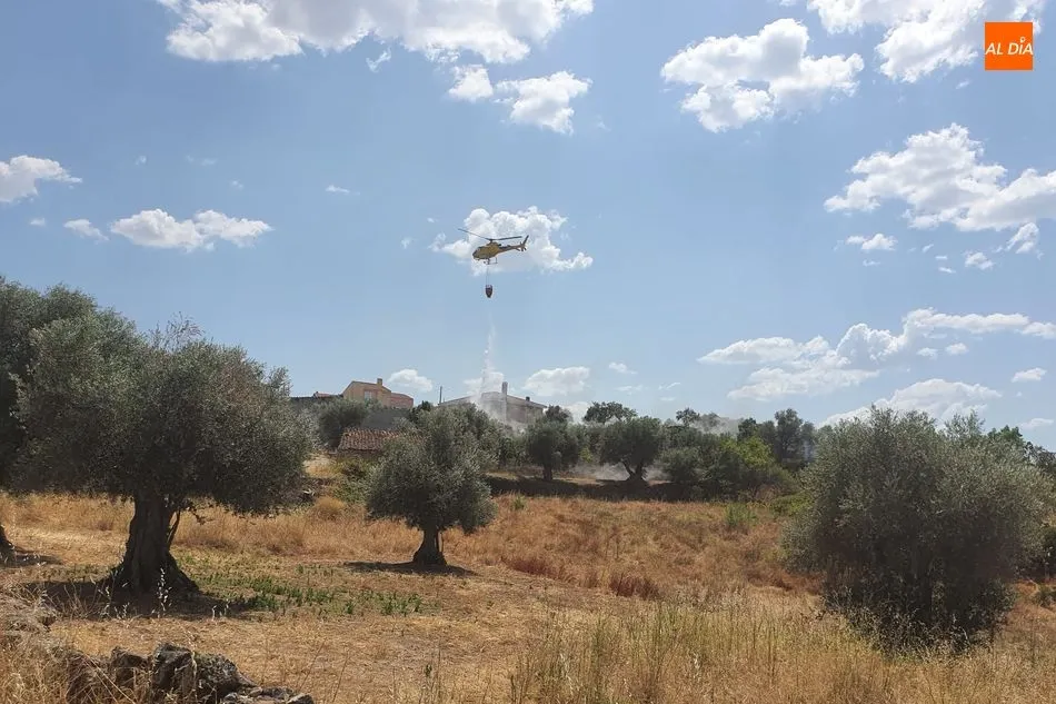 Efectivos contraincendios de la Junta de Castilla y León, Bomberos de la Diputación y Guardia Civil participan en la extinción de un fuego declarado en Villarino de los Aires a primeras horas de la tarde de este jueves 9 de julio.
