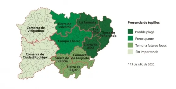 A la amargura de los bajos precios en el cereal, ahora se le añade los daños por estos roedores que los agricultores se encuentran en sus tierras por esta época de cosecha. La zona de Peñaranda de Bracamonte, La Armuña, Las Villas y Alba conformas las zonas donde está a punto de convertirse en una plaga en los próximos días. Los topillos están dañando al cereal y en Peñaranda, sobre todo, atacan a forrajes como la alfalfa; lo que supone un duro golpe a la ganadería de la zona ya que se utiliza para la alimentación animal. También se están cebando con otros productos en regadío como la patata y la remolacha; y las huertas están saturadas de topillos.