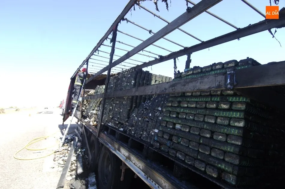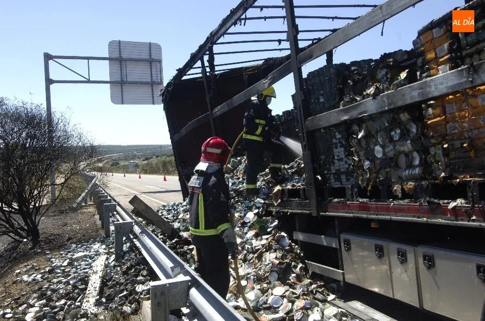 Un camión cargado de latas de conserva de todo tipo echó a arder por motivos desconocidos a última hora de la mañana del miércoles en la Autovía A-62, a la altura de Carpio de Azaba (quedó detenido justo en la entrada a Carpio desde la A-62 llegando desde Portugal).