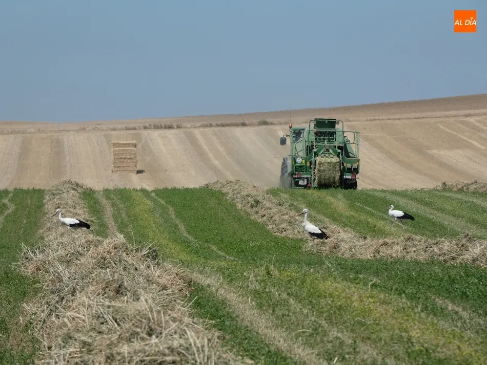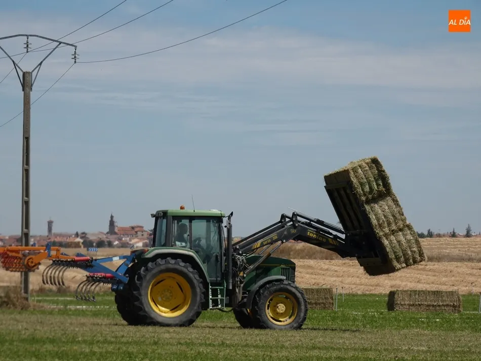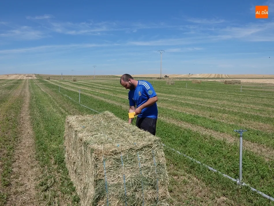Los agricultores de Cantalapiedra recogen el tercer corte de alfalfa. Han realizado la siega y, cuando la temperatura es adecuada, procede al empacado de forraje. Lo hacen en horas frescas para evitar que se deshaga demasiado.