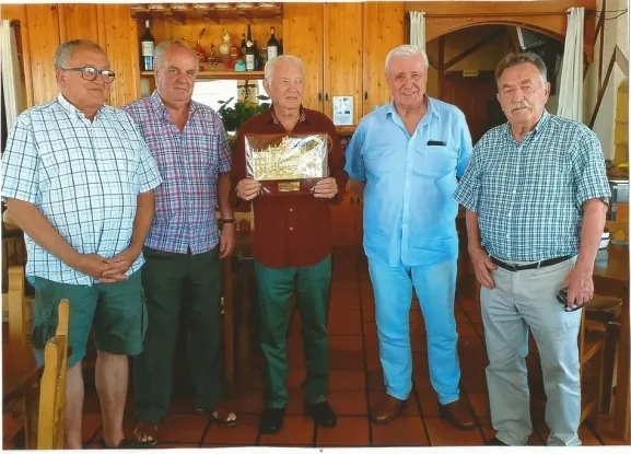 - Pues me ha ?pisado? usted el tema que yo quería exponer cuando al principio le decía: ?Pues hoy tenemos mucho que hablar.?Y así ocurrió; después de esta reunión reducida de un grupo de amigos. Primero en la-Parcela-, degustando nuestro ya clásico-Vermú- con anchoas y unos ricos cangrejos (¡Recién pescados!), y que había llevado-José Ignacio-. Más tarde sería la comida ?seria? en el estupendo mirador del restaurante ?El Mirador? de Cabrerizos. Con entrega final de una placa vistosa conmemorativa de tal día de? ¡Hace tantos años! Puedo asegurarle ,señor Manuel, que sentí vivamente esa empatía de la que hablábamos antes y también mucho agradecimiento a usted y a los amigos de la-Peña Los Magníficos que me acompañaron en esos momentos.