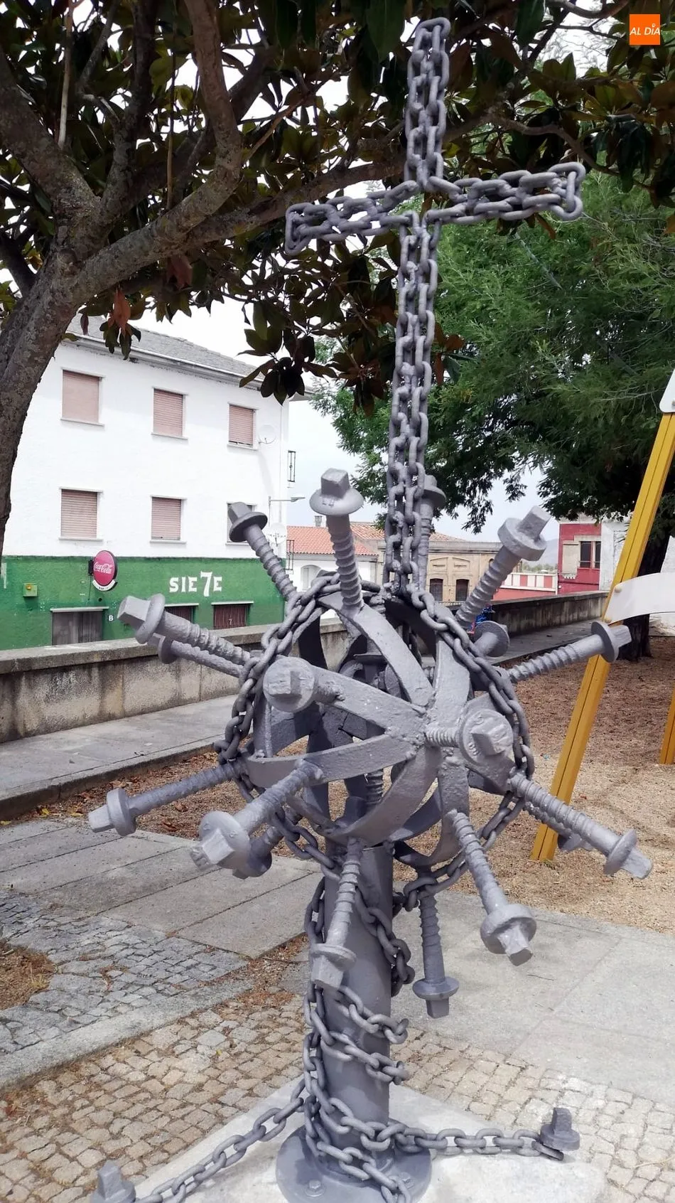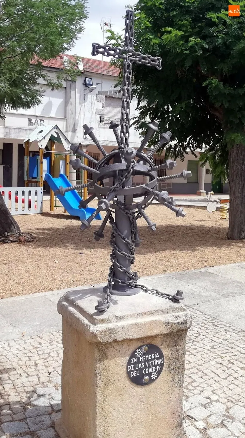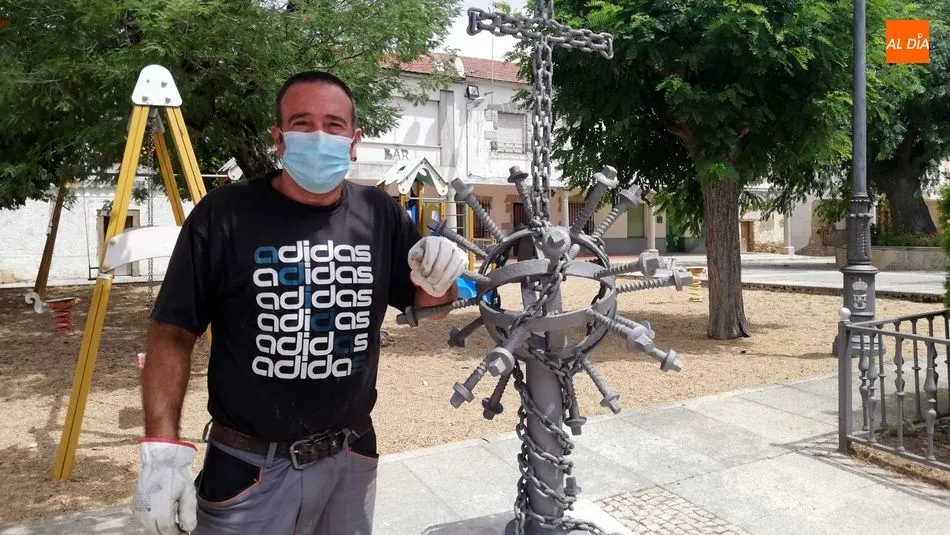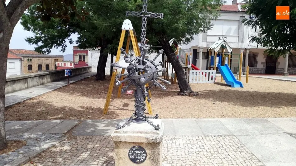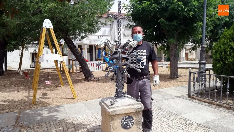 La Plaza de La Fregeneda acoge desde ayer un nueva obra maestra con un simbolismo muy especial. Se trata de un monumento 'In Memoria de las victimas del Covid-19' una construcción en hierro cargada de referencias a la pandemia del coronavirus que tantas muertes ha causado en el mundo, obra que aúna el ingenio con la sensibilidad de su autor, Santi Fernández, artesano local y alguacil del municipio. "Durante el confinamiento yo sufría pensando en todas las personas que estaban muriendo en soledad y tenía una espinita clavada, tenía que hacer algo en su memoria, como una despedida que no le estábamos dando porque no podíamos" explica Santi.
