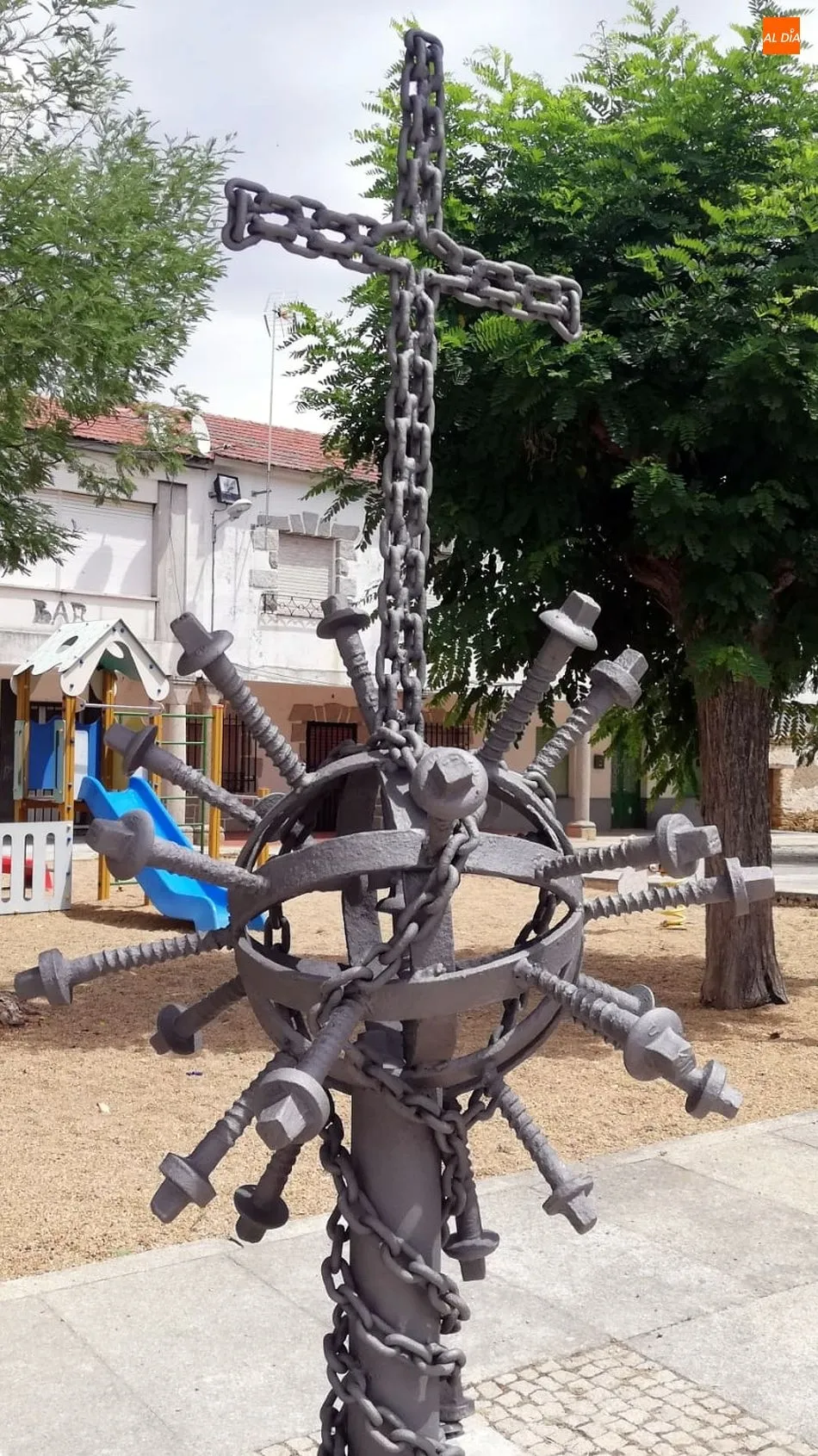 El artesano se puso manos a la obra, utilizando los materiales que tenía a mano (materiales reciclados, como los que ha utilizado en otras obras salidas de sus manos): hierros de las ruedas de un carro de labranza, tornillos desprendidos de los raíles de la vía férrea de La Fregeneda....