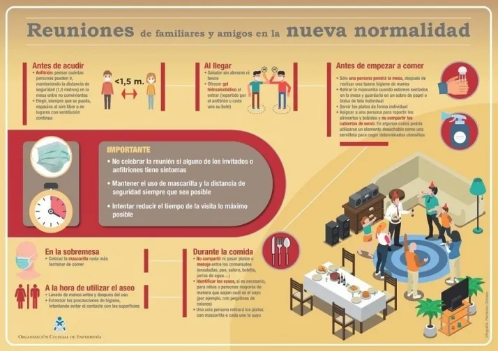 El Consejo de Enfermería ha elaborado una infografía y un vídeo animado con pautas para que la población pueda reunirse con seguridad con familiares y amigos y evitar brotes: no compartir utensilios ni platos, utilizar la mascarilla en todo momento y reducir el tiempo de las visitas son algunas de ellas.