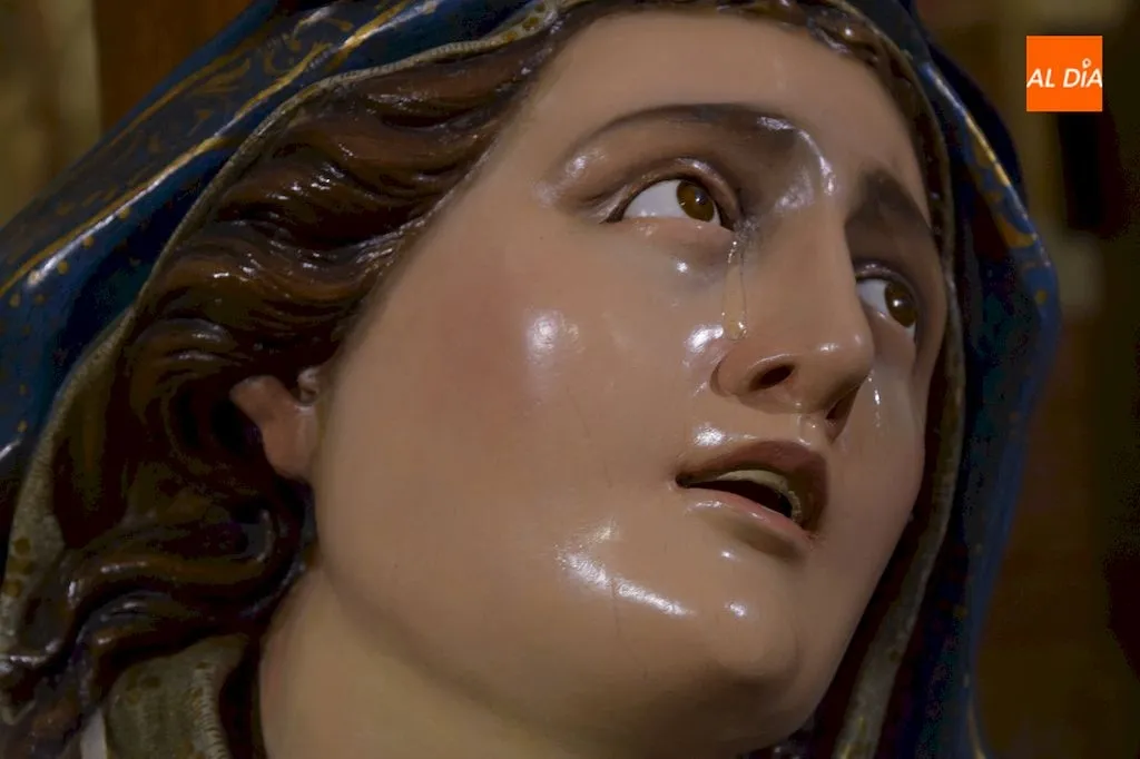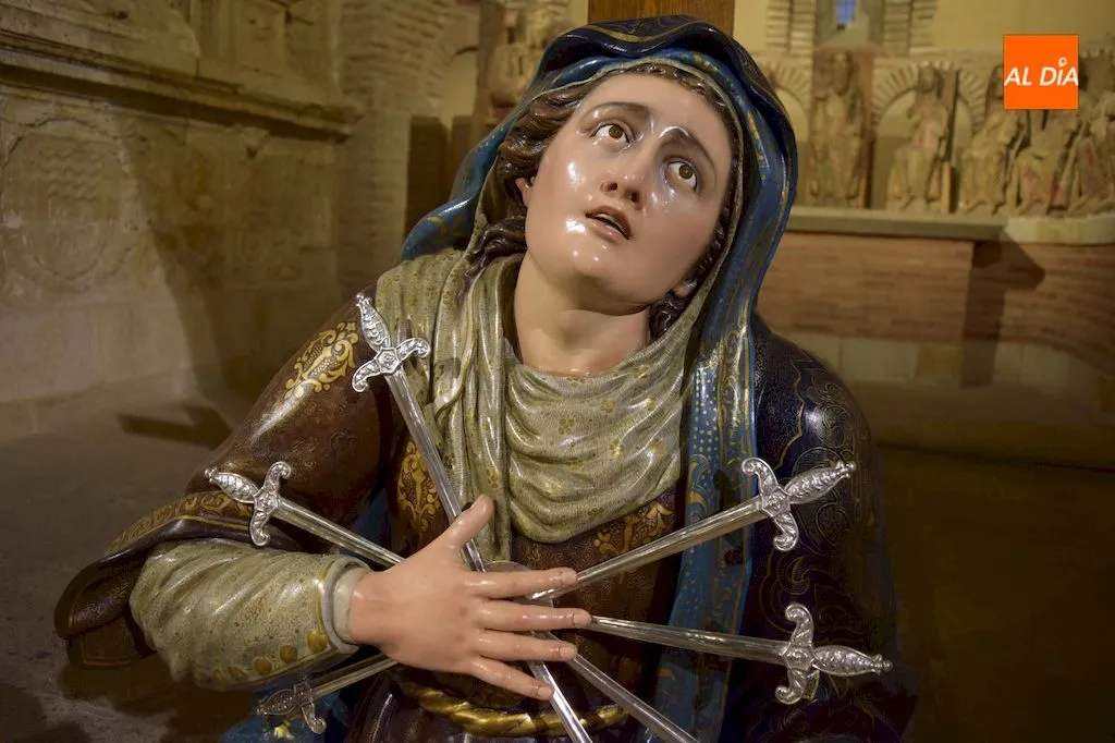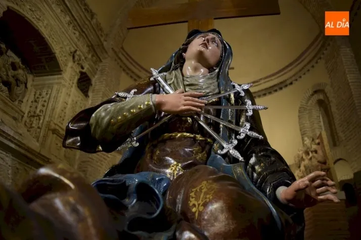 La talla de la Virgen de la Dolorosa ha sido presentada este viernes al público tras su restauración a cargo de la Fundación Edades del Hombre. Esta acción ha sido promovida por la Junta de Cofradías de la Semana Santa de Alba de Tormes con el objetivo de devolverla a su máximo esplendor y subsanar los desperfectos de la imagen.