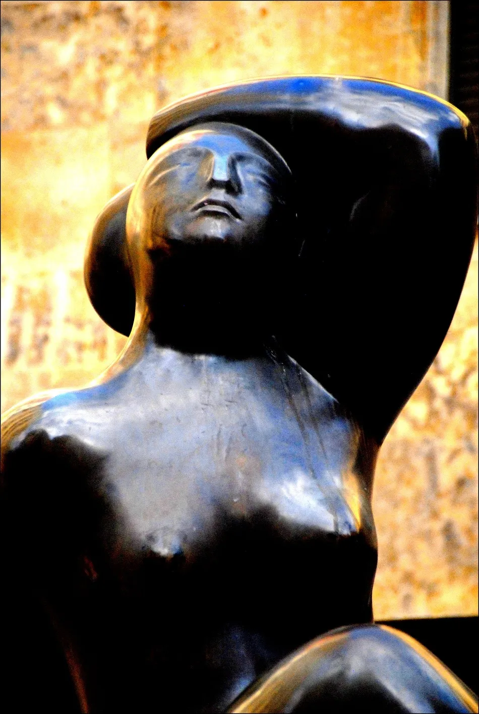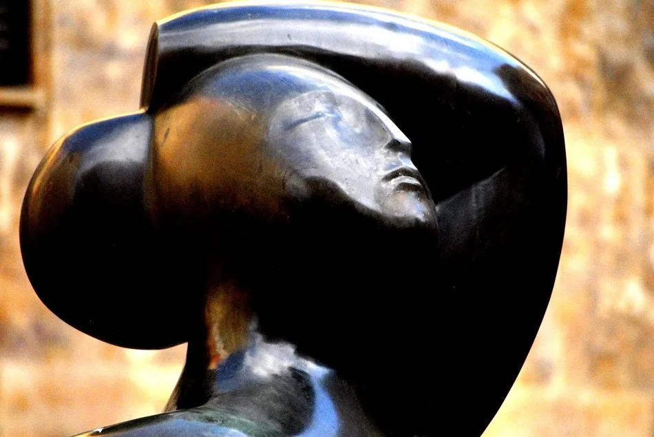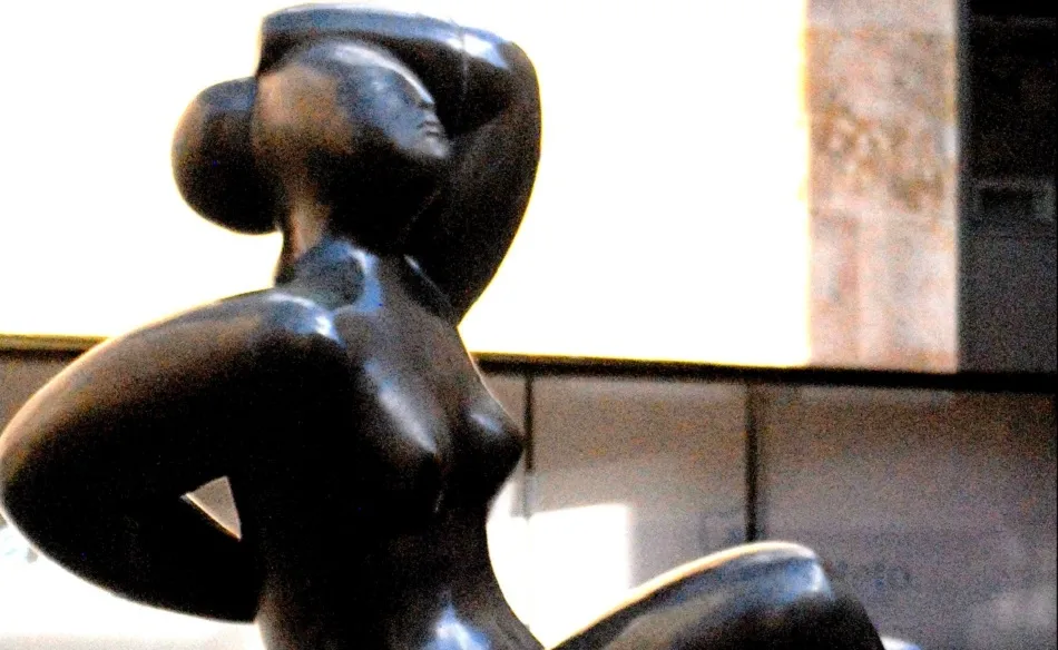 Una mujer que gira sobre sí misma, torso, cabeza, piernas generosas. Bronce pulido para elevar el desnudo femenino a la pura belleza de la forma, casi abstractas las redondeces, rostro de oliva, pecho pequeño? Bruñida por el sol, veraniega en su entrega a la luz que resbala sobre la materia, la estatua sugiere un Botero escondido, un Baltasar Lobo de suaves redondeces. Sin embargo es una insospechada pieza de Hipólito Pérez Calvo, el escultor zamorano radicado en Salamanca a quien siempre asociamos a la maestría de la talla religiosa, a la figuración absoluta de sus retratos realistas. Sorpresa dulce y rotunda esta mujer sobre la cual juega la luz para posar ante la cámara de Amador Martín, casi viva, deliciosamente impúdica.