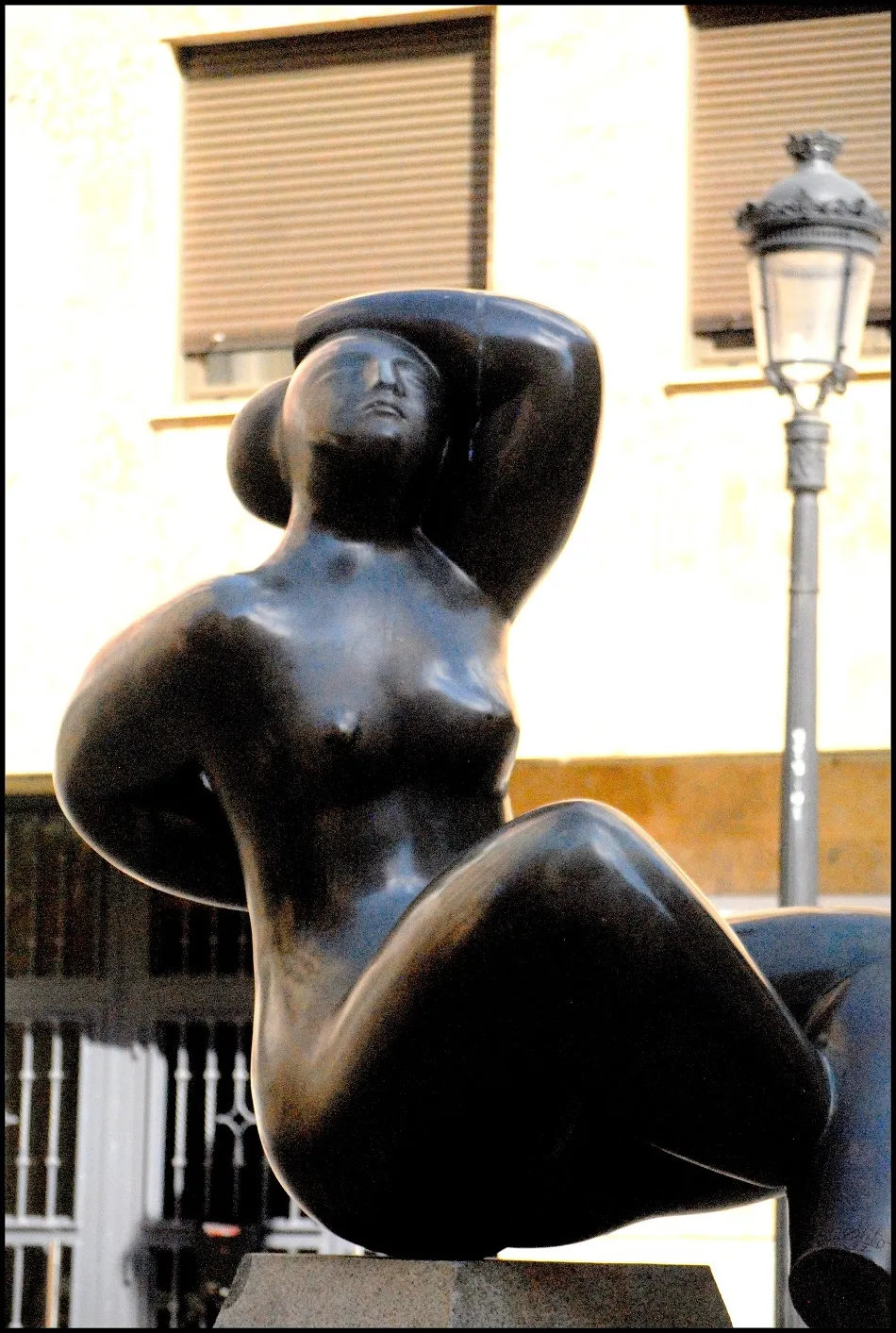 La mirada atenta del fotógrafo desvela su existencia sobre el pedestal de granito. Fija la luz sobre su piel rotunda. Recuerda el pulido del artista una vez vaciada esta mujer de sólidas redondeces. Qué esforzada la tarea del escultor, que expuesta la pieza al vandalismo de la calle, a la intemperie de los elementos, a las miradas que no ven? sin embargo, qué generosa es la obra escultórica abierta a todas las miradas, regalo de todos que toma el fotógrafo como una ofrenda solo para sus ojos. Y la originalidad del profesor, del artista tranquilo, mesurado, amante de la sencillez, de la armonía y sobre todo, de la belleza, se despliega ante nosotros. Y el obturador de Amador, siempre atento a la luz, capta en toda su plenitud a una mujer viva, habitante de su intimidad privada, ahí, en las calles de Salamanca, fruto de un artista de múltiples vuelos, Hipólito Pérez Calvo.