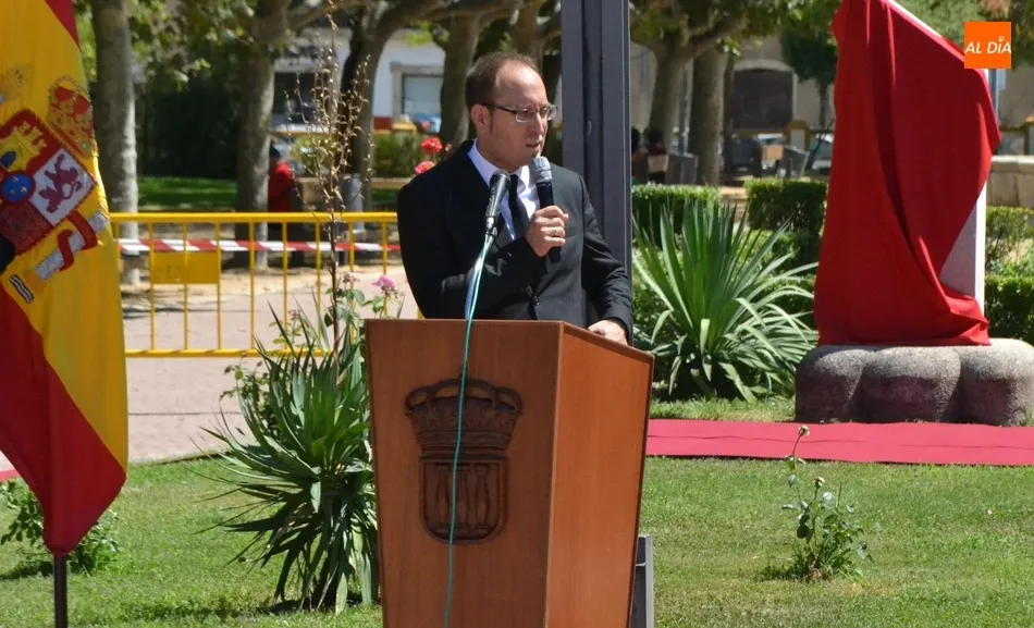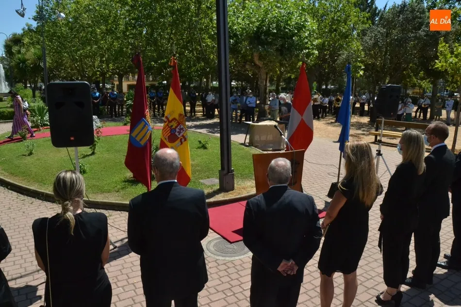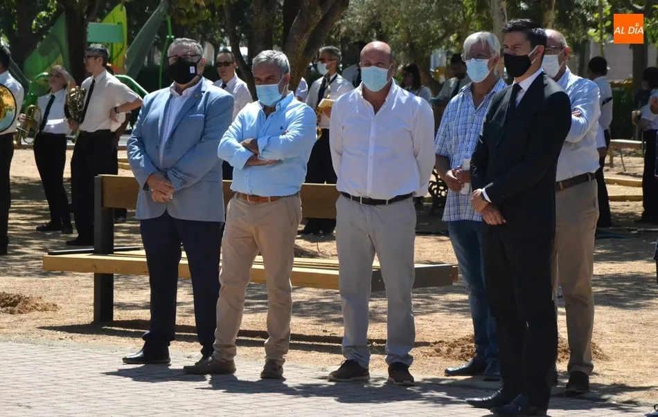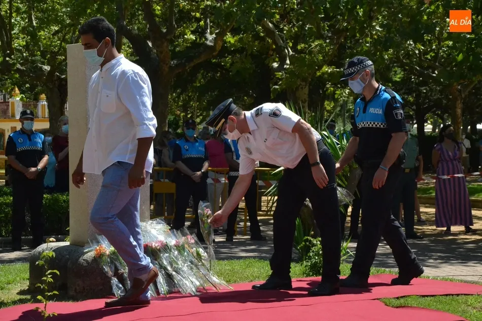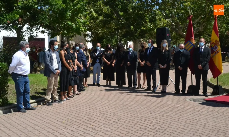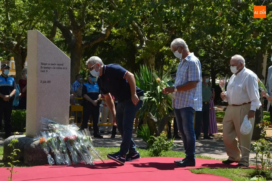 Finalizadas las intervenciones, el alcalde Marcos Iglesias, acompañado de dos niñas, procedió a descubrir el monolito del que hablábamos al principio, en el cual depositaron flores todos los políticos asistentes, así como representantes de todas las entidades sociales participantes, todo ello mientras la Banda de Música interpretaba otra pieza. Tras guardarse un minuto de silencio, el acto se cerró con la Banda interpretando el Himno de España.
