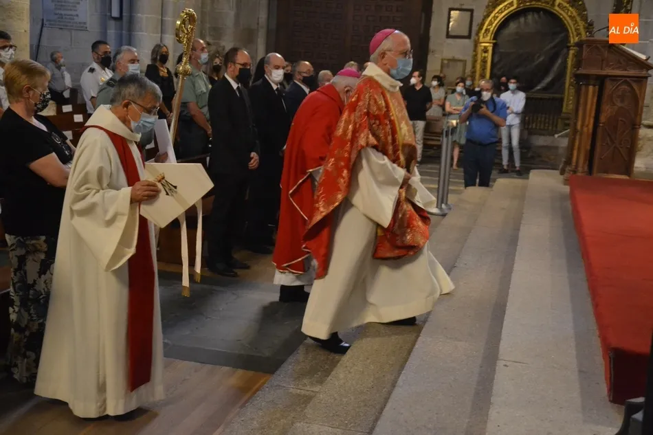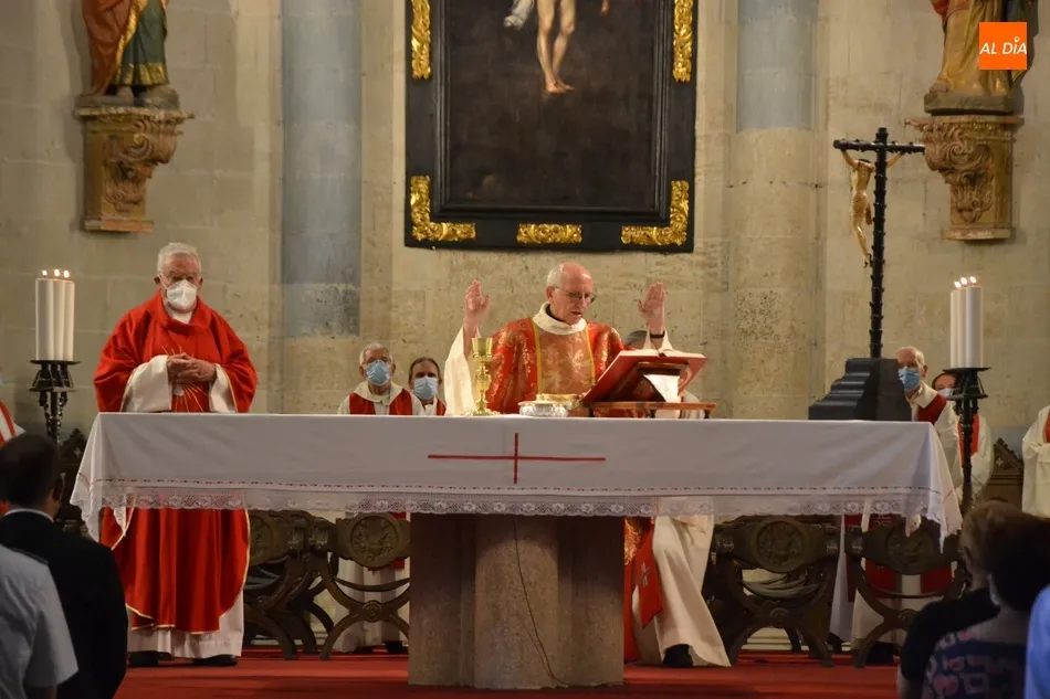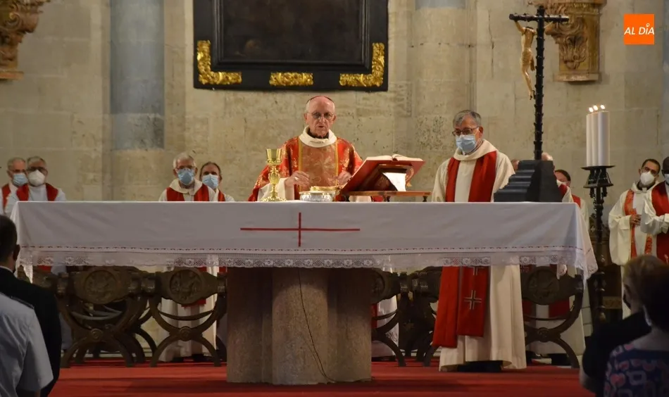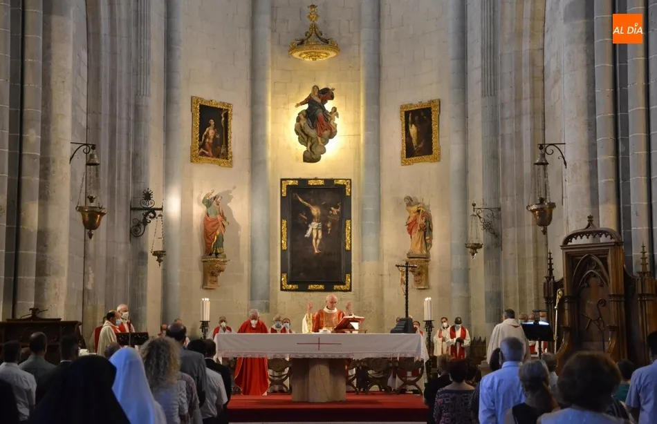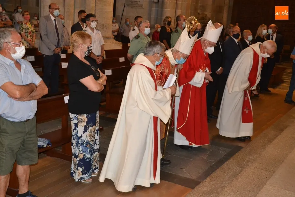 La celebración religiosa ?en la cual tocó uno de los órganos de la Seo Manuel José Gutiérrez- fue presidida por el Administrador Apostólico de la Diócesis, Jesús García Burillo, quién estuvo acompañado por el Obispo emérito de Sigüenza-Guadalajara, el guinaldés José Sánchez; por el presidente del Cabildo Catedralicio, Ángel Martín Carballo; y por un amplio número más de sacerdotes diocesanos, quienes directamente accedieron al Presbiterio de la Seo sin participar en el habitual desfile hacia el altar que sí realizaron los prelados.