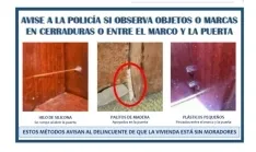 Igualmente se solicita que se avise a la Policía si se observan objetos o marcas en cerraduras o entre el marco y la puerta; estos son métodos que avisan al delincuente que la vivienda está sin sus moradores.