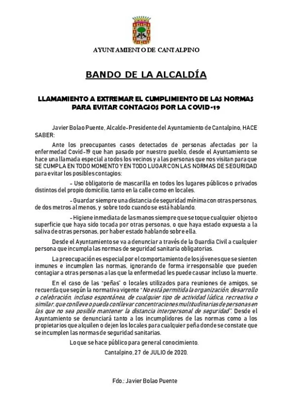 El alcalde de Cantalpino, Javier Bolao Puente emitió ayer un bando con el que hace un ?llamamiento a extremar el cumplimiento de las normas para evitar contagios por la COVID-19?.