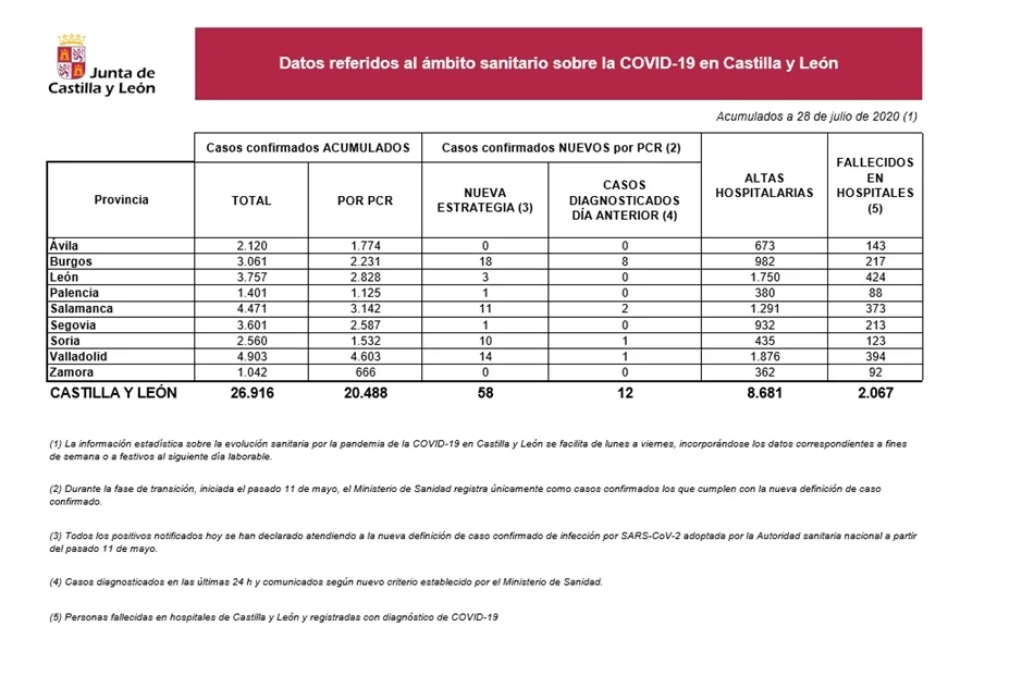 Castilla y León notifica 58 nuevos casos de la enfermedad COVID-19 y el número actual acumulado es 26.916; de esa cifra, 20.488 tienen confirmación mediante PCR.