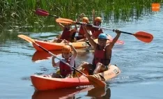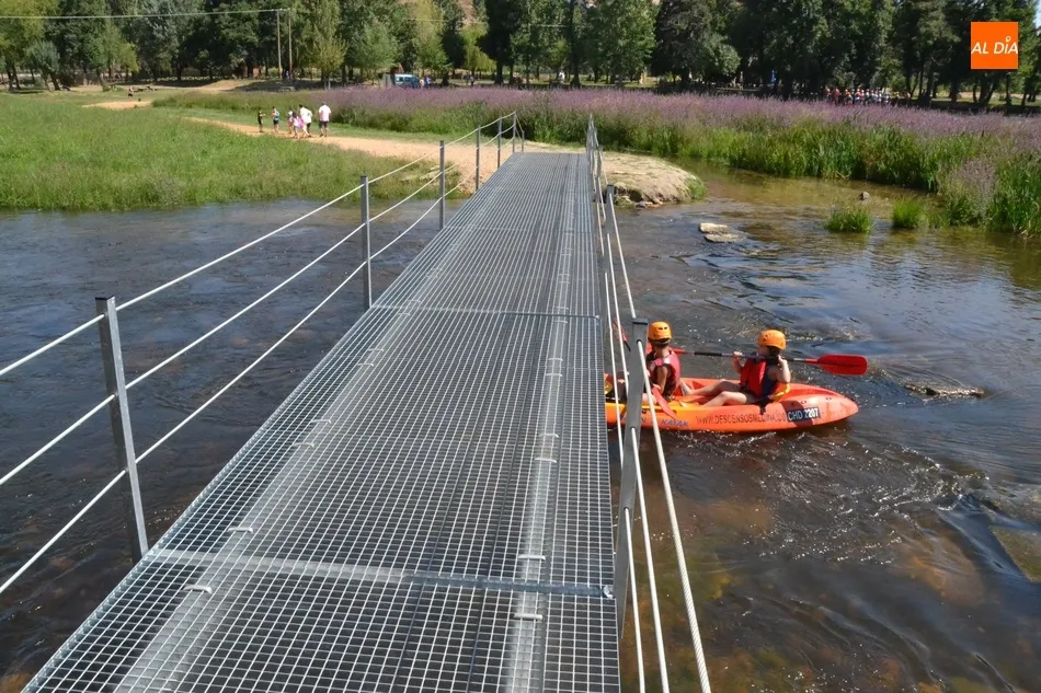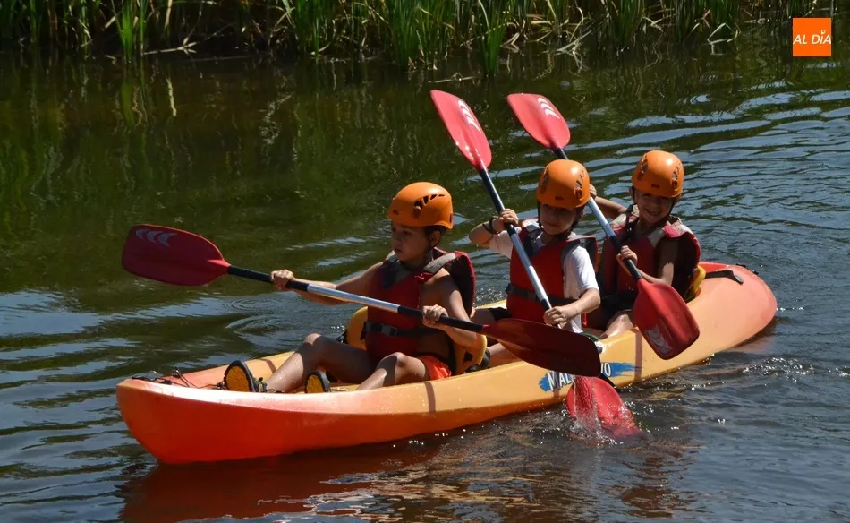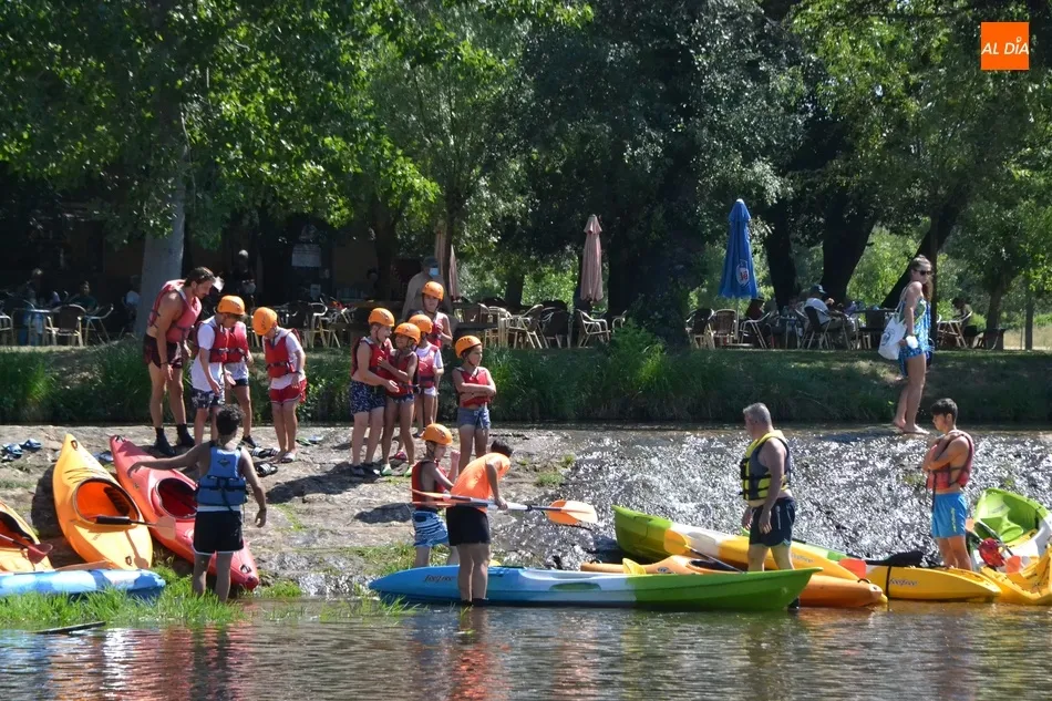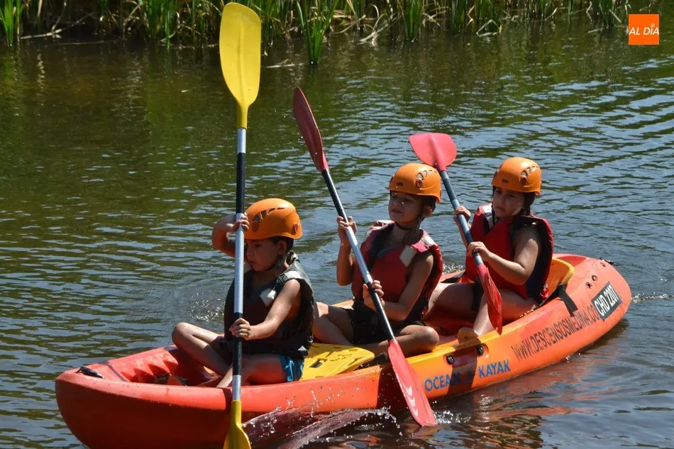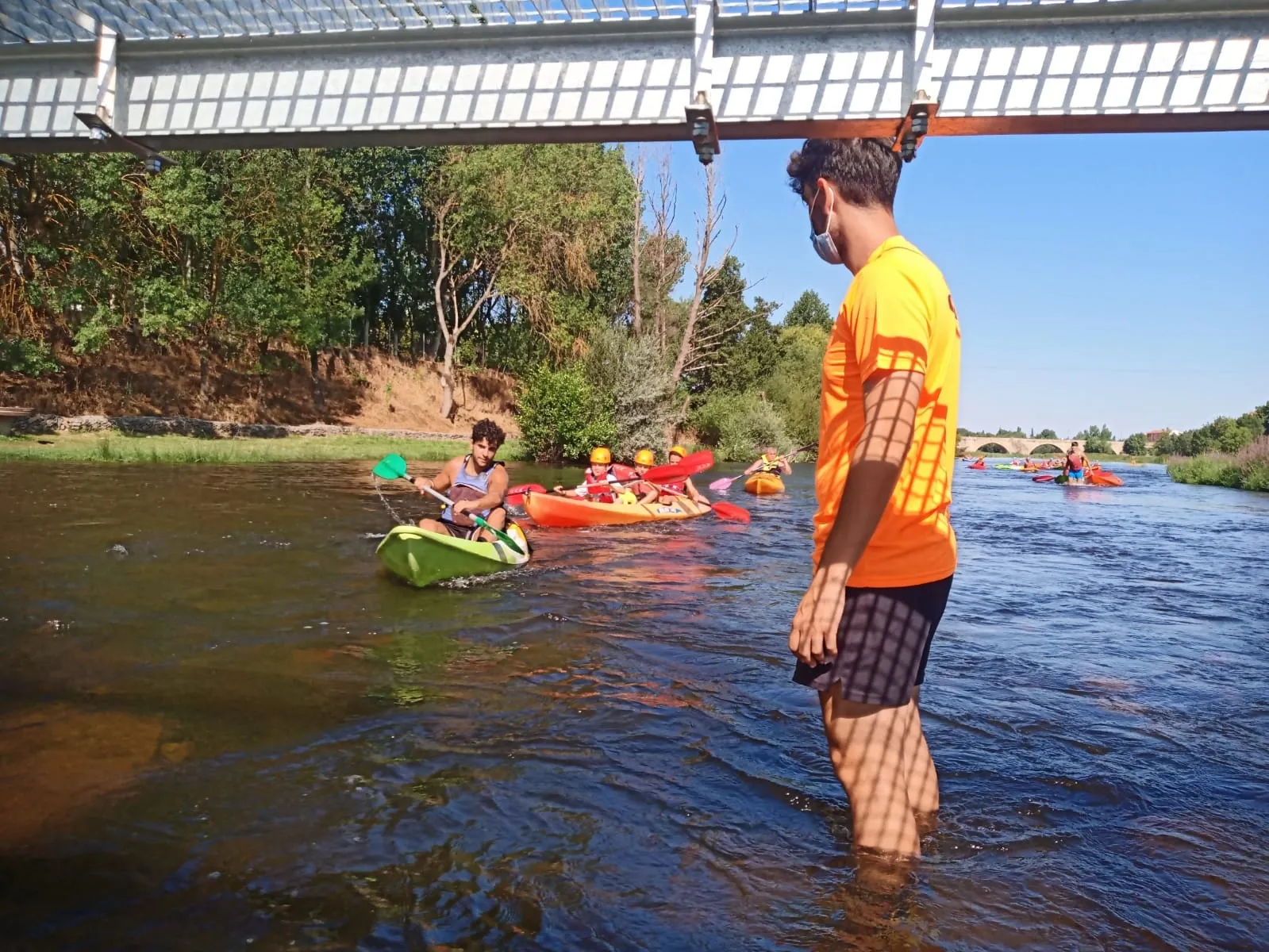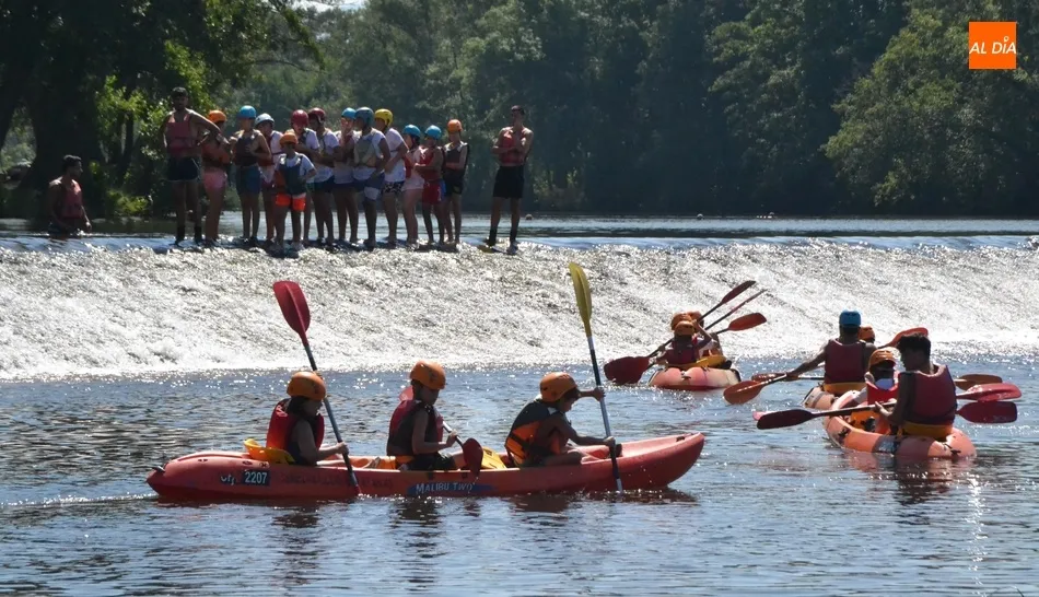 Con este motivo, participantes y monitores se acercaron en la mañana del miércoles, en vez de hasta los Campos de Toñete, hasta las instalaciones de Descensos Medina en la zona de El Paraje, para ponerse los chalecos salvavidas y coger las piraguas y los remos correspondientes para adentrarse en las aguas del Águeda en dirección al Puente Nuevo, desde el que siguieron hasta la presa de La Pesquera, donde hicieron un descanso.