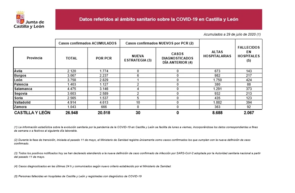 Castilla y León notifica 30 nuevos casos de la enfermedad COVID-19 y el número actual acumulado es 26.948 ; de esa cifra, 20.158 tienen confirmación mediante PCR.
