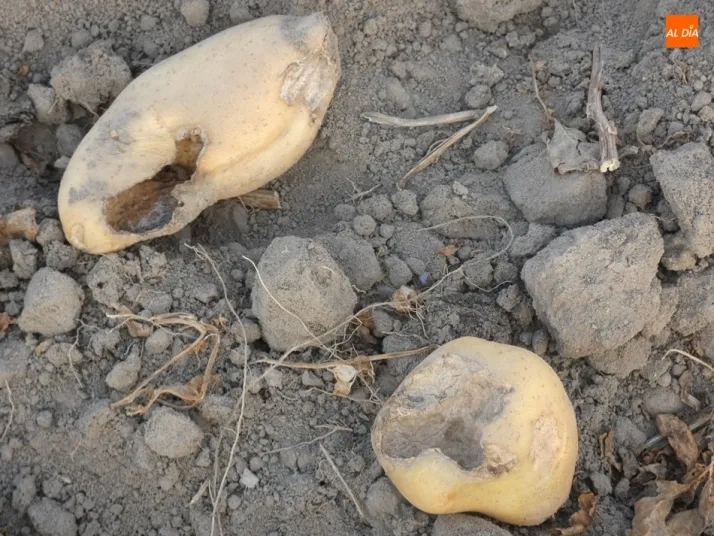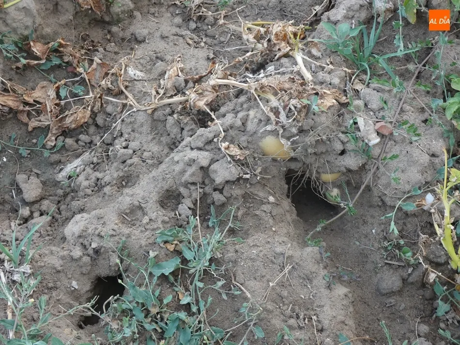 En las parcelas se ven numerosas galerías excavadas por el roedor y, entre las patatas cosechadas se ven destriadas algunas mordidas por los topillos.