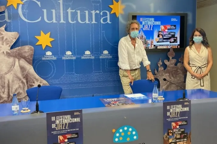 La concejala de Cultura, María Victoria Bermejo, y el coordinador del festival, Fernando Viñals, han presentado este jueves el III Festival Internacional de Jazz que organiza el Ayuntamiento de Salamanca y que se celebrará en el Patio Chico del 5 al 7 de agosto.