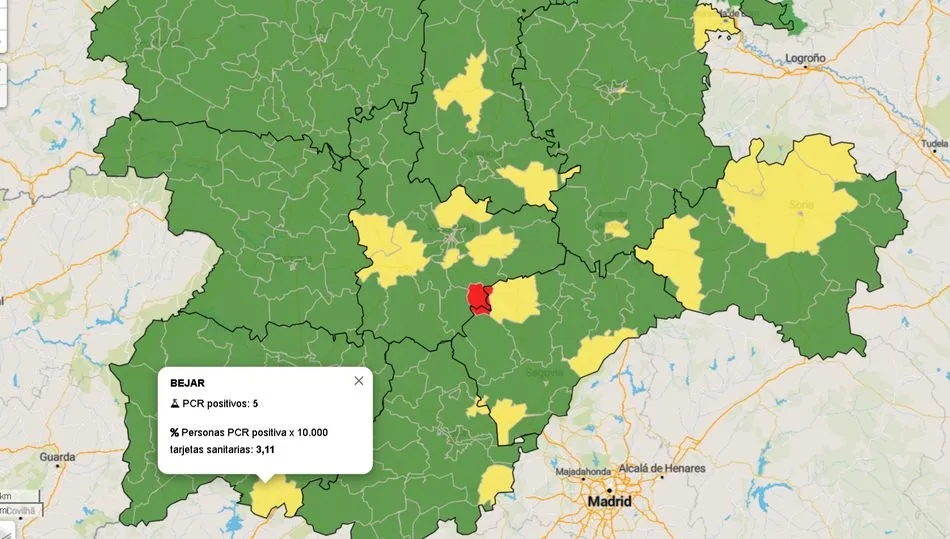 Suben de 626 a 633 el número de personas enfermas por COVID-19 en la zona de salud de Béjar en la última semana, siete nuevos casos que colocan a esta zona básica de salud en la única en color amarillo de toda la provincia, con cinco positivos por cada 10.000 habitantes en los últimos siete días.