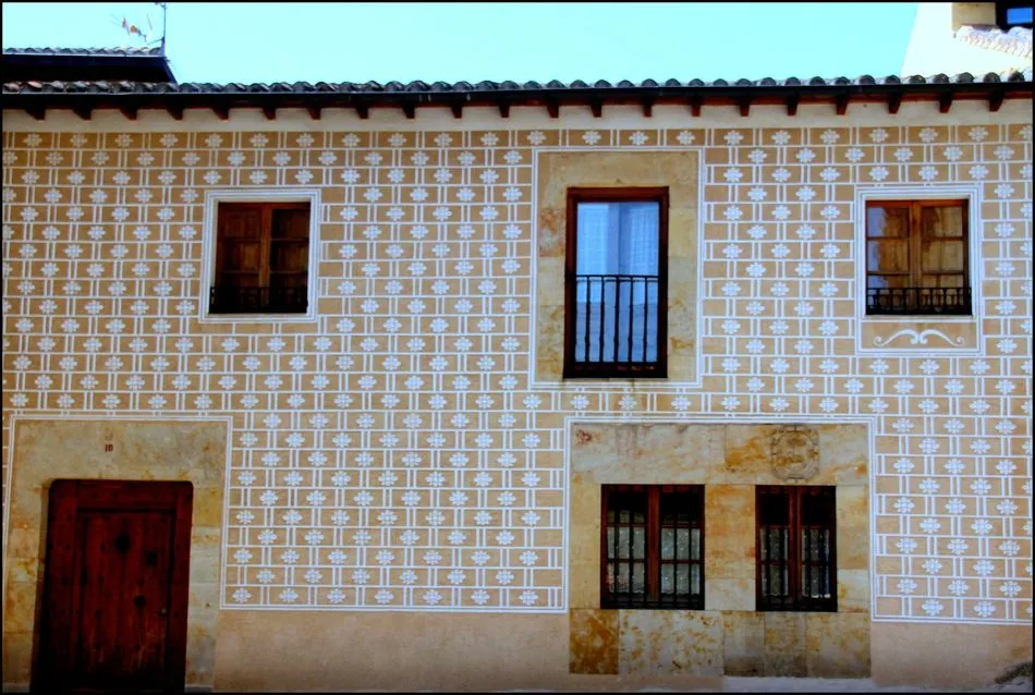 ¿Qué impulso ancestral nos lleva a adornar, proteger la casa que habitamos? ¿Qué nos lleva a pintar, revocar, labrar las paredes del techo que nos cobija? Construimos, adornamos, mostramos al exterior la riqueza de nuestro lar, de ahí que los palacios, las casas solariegas segovianas, abulenses, extremeñas, salmantinas se cubran de espumas blancas, de adornadas grecas sobre ventanas y puertas. El muro se hace lienzo asomado a la calle, adornado por ese esgrafiado que escribe sus signos sobre el revoque de varias capas que se punzan para mostrar el delicioso bordado del esgrafiado mudéjar, el esgrafiado renacentista, el juego de Escher que nos devuelve al gusto por la geometría repetida hasta la hipnosis. Contemplamos los renglones de la pared con admirada sorpresa, nos sumergimos en su greca curvada que sustenta, paradójicamente, la estructura del tejado. Es la magia arquitectónica de la casa que se levanta.