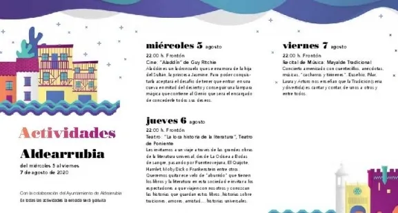 Esta semana llegan a Aldearrubia las Noches de Cultura de la Diputación Provincial de Salamanca con la colaboración del Ayuntamiento de Aldearrubia. Se trata de tres jornadas de entretenimiento gratuitas que serán puestas en escena en el frontón. El miércoles, 5 de agosto, se proyectará Aladdín a las 22:00; el jueves, habrá teatro a cargo de Teatro Poniente con ?La loca historia de la literatura?; y el viernes, el público asistente podrá disfrutar del recital de música: ?Mayalde Tradicional?.