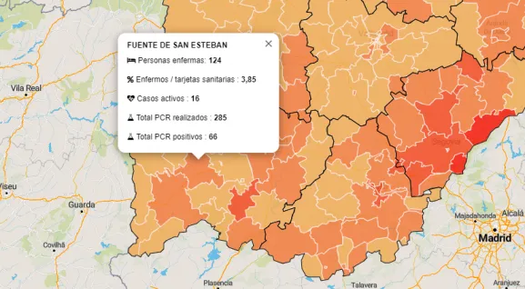 El cambio con sentido favorable se da en las zonas de Fuentes de Oñoro y Fuenteguinaldo, donde baja en cada una de ellas en una persona el número de casos activos, quedándose ambas zonas con sólo 1. Asimismo, y de forma llamativa, también se reduce el número acumulado de personas enfermas con los que cuenta cada una, quedándose en 19 y 23, respectivamente.