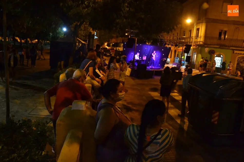 En concreto, la actuación de En3Jazz tuvo lugar sobre un pequeño escenario montado en la intersección entre las calles Laguna y Peramato, ?mirando? a las terrazas de los bares de la calle Laguna, que estuvieron llenas durante la hora y media que duró el concierto. Asimismo, hubo unas cuantas personas más siguiendo el concierto de pie por los alrededores, especialmente desde el muro del Parque de La Glorieta, al mismo tiempo que unos cuantos niños jugaban en su parque infantil.