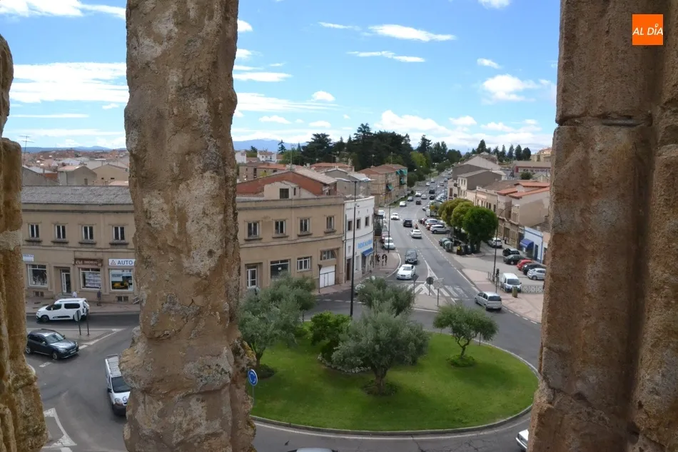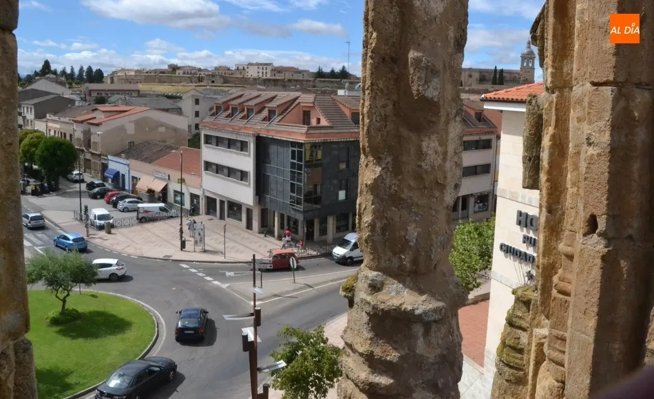 A través de ese ventanal se puede contemplar toda la rotonda del Cruce, así como sus vías adyacentes, destacando la visión existente de la Avenida de España, por la cual el trajín de vehículos era constante a media mañana del jueves. Desde ese lugar se pueden contemplar asimismo dos de los otros edificios patrimoniales de mayor altura de Ciudad Rodrigo: la Iglesia de Cerralbo y la Catedral de Santa María.