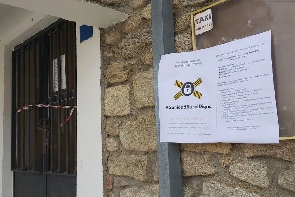 Distintos colectivos sociales exigen a la Junta una sanidad digna en el medio rural     | Imagen 1Este acto reivindicativo ha consistido en la colocación en los consultorios de un cartel con el icono de un candado, que simboliza la dificultad de acceso a la sanidad para los habitantes del mundo rural castellano y leonés, y el lema ?Sanidad rural cerrada, dignidad rural atrancada?. Al mismo tiempo se colocaba en las puertas de cada consultorio una cinta de señalización de obras para simbolizar ?que se nos está cerrando el acceso a un servicio básico en las zonas rurales?, señalan los organizadores.