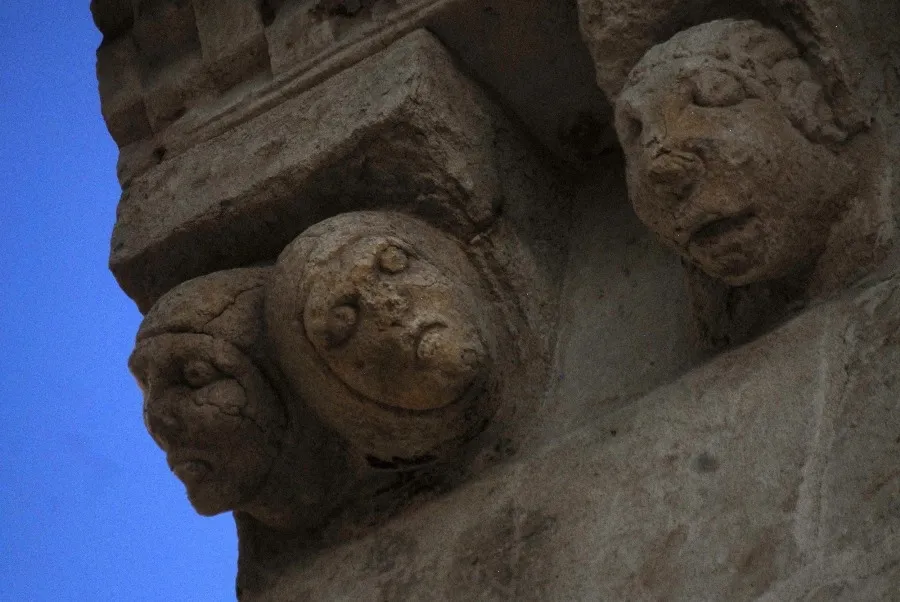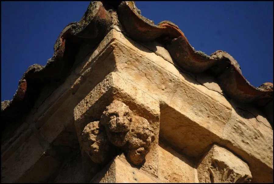 Escuela parroquial en 1920, tiene esta iglesia un silencio de árboles, de paseo, de quietud sin paso apresurado. Se guarda el Cristo románico entre sus recias paredes mientras afuera, los motivos de las cornisas, interpelan al observador paseante: grifos, jabalíes, arpías, cruces, rollos, bolas, leones? y sobre todo cabezas grotescas que se ríen desde arriba y parecen querer tirarnos el barril que uno de los personajes sujeta, risa goliarda de bromas medievales, latines de taberna y liturgias de borrachos. Dicen que eran los rostros de las gentes de aquel entonces, caballeros y villanos de la tierra retratados por el cantero cruel del escarnio. La edad media no sabe de astronautas ni de estudiantes que ornan los bajorrelieves modernos, el medievo tiene sorna y crueldad, guiño soez y obsceno. Sin embargo, los secretos de esta iglesia recogida, recoleta, florecida en el cerro de la historia, nos devuelven también la magia del cantero medieval que trasciende su arte? hojas y flores en el círculo de la pared, sutil adorno inesperado.