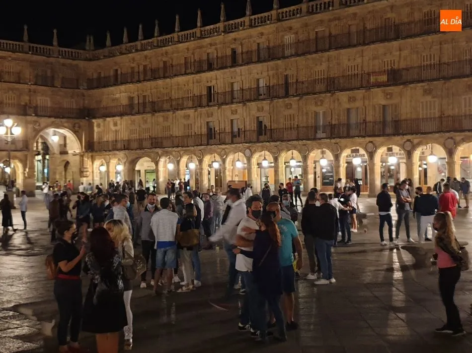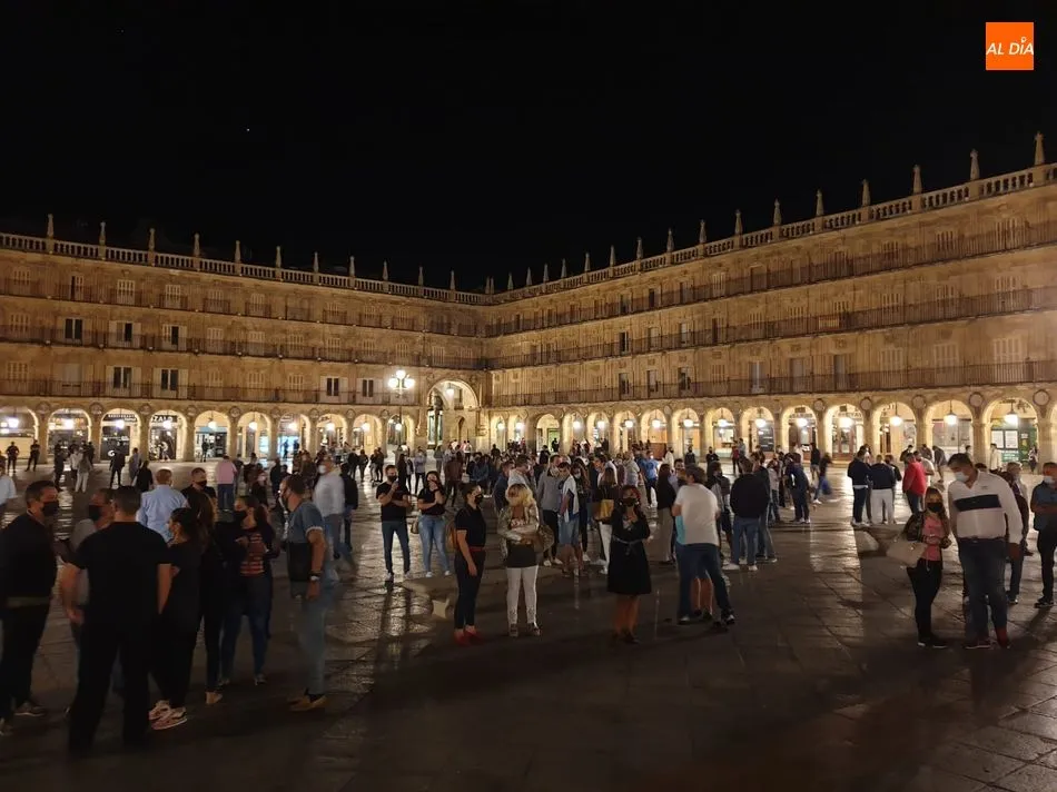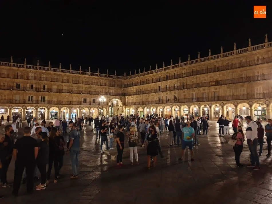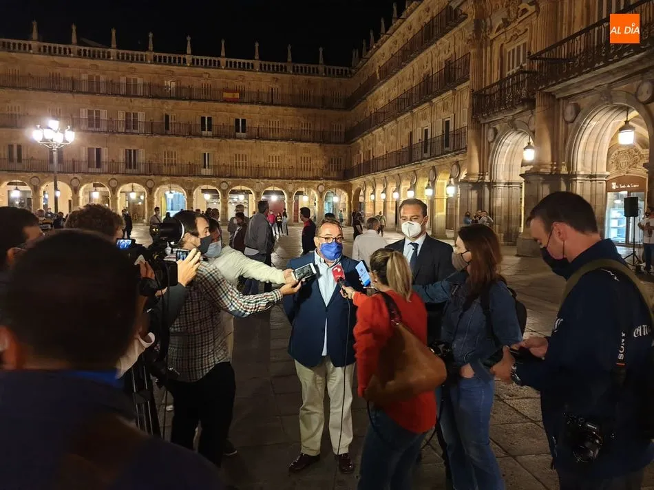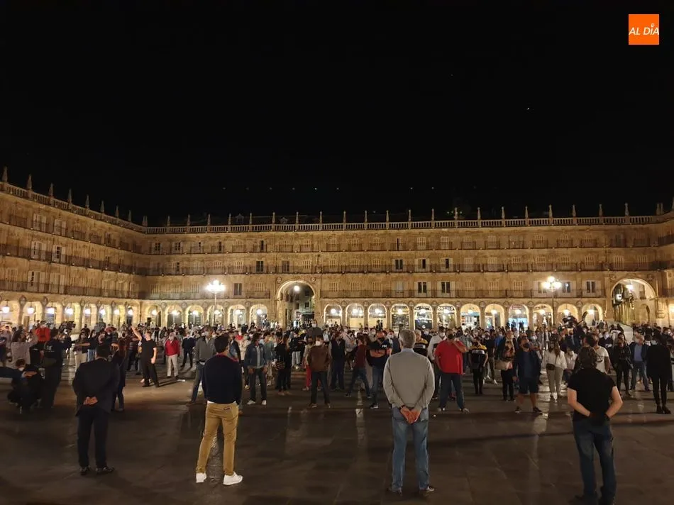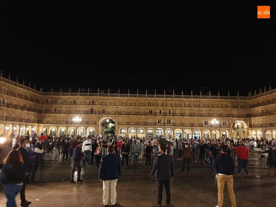La Plaza Mayor ha acogido la concentración, convocada por la Asociación de Empresarios de Hostelería de Salamanca y Provincia y que ha contado con la presencia, entre otros, del presidente de la Confederación Empresarial de Hostelería de España, José Luis Yzuel, para protestar por las medidas de las autoridades que han obligado al cierre a los establecimientos dedicados al ocio nocturno (discotecas, bares de copas y salas de conciertos).