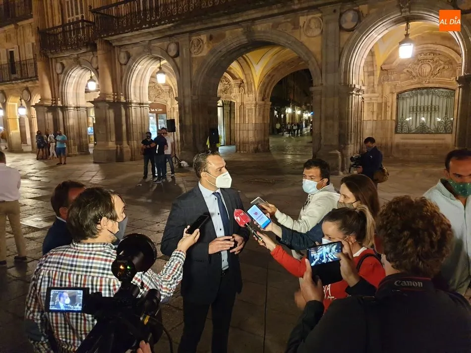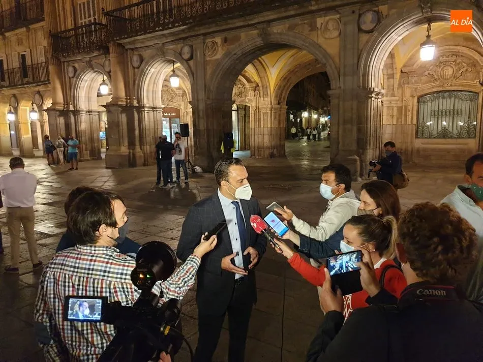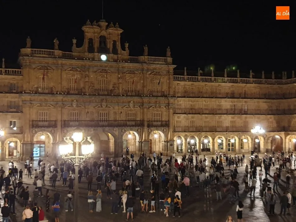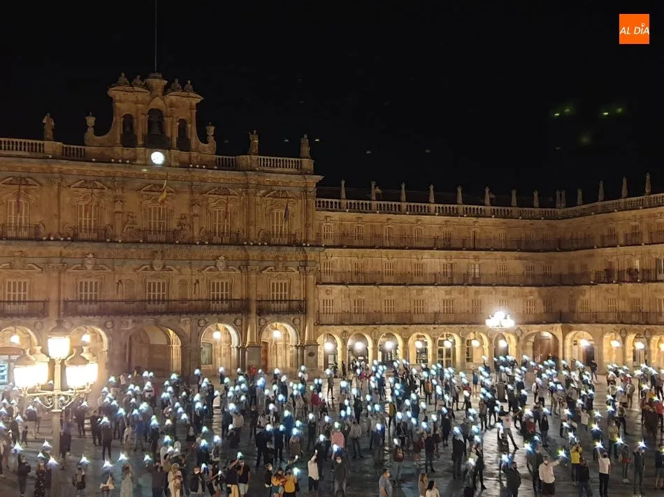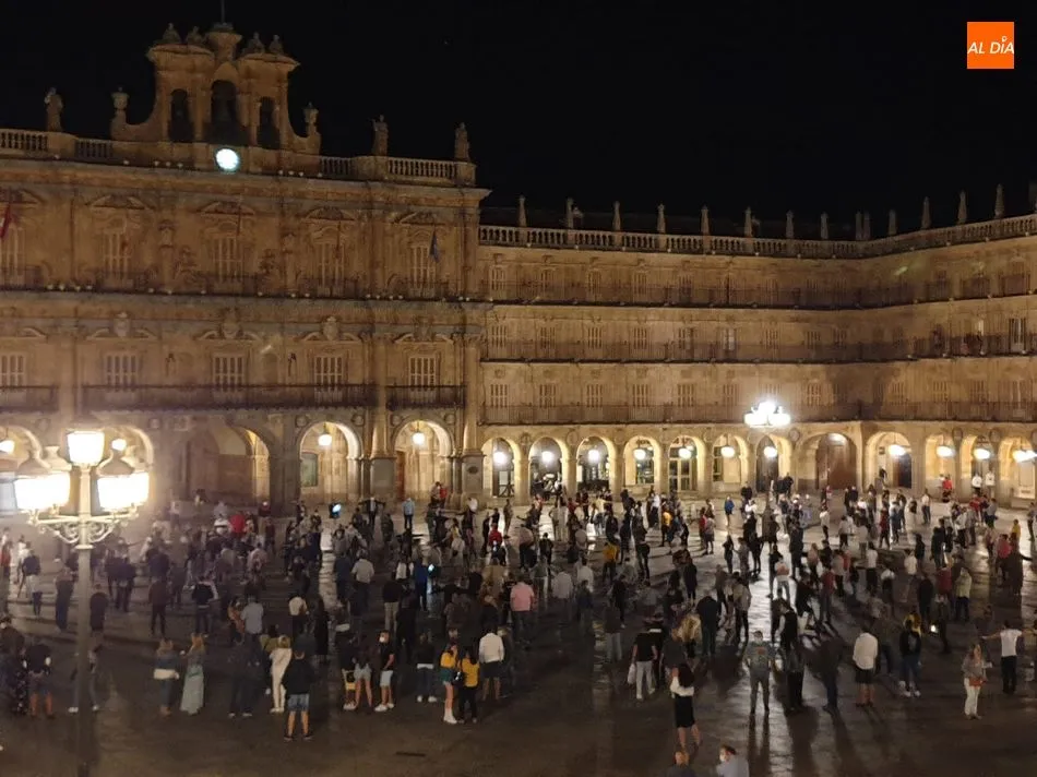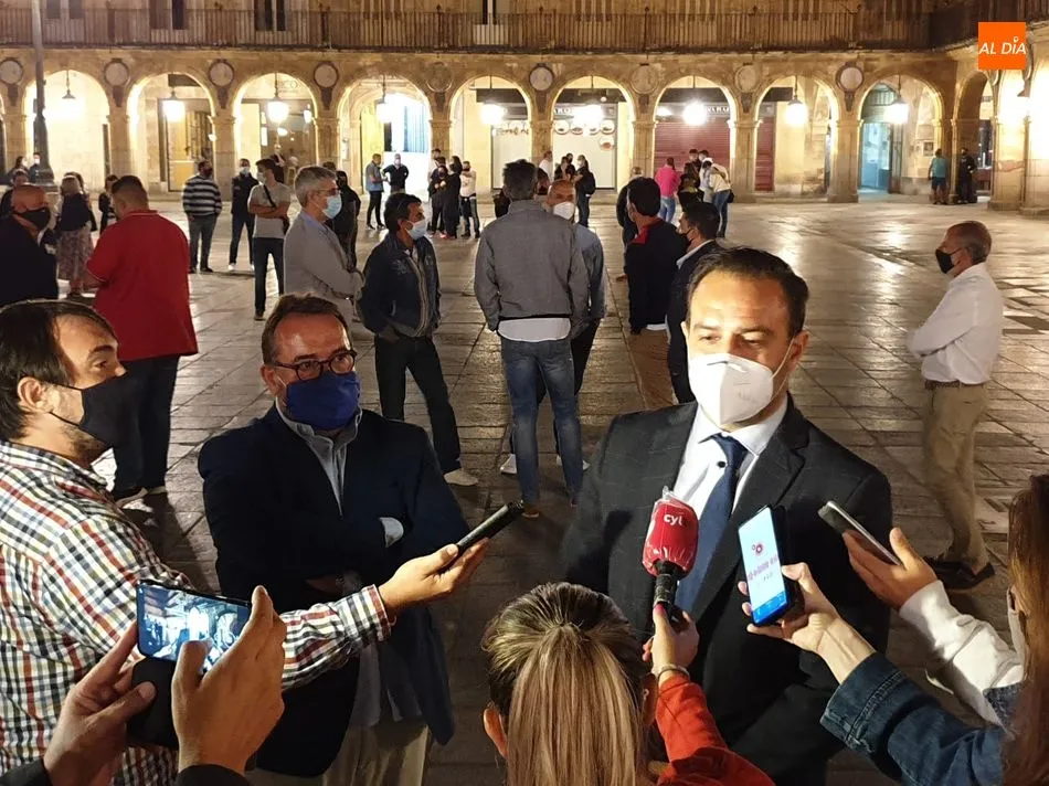 La Plaza Mayor ha acogido la concentración, convocada por la Asociación de Empresarios de Hostelería de Salamanca y Provincia y que ha contado con la presencia, entre otros, del presidente de la Confederación Empresarial de Hostelería de España, José Luis Yzuel, para protestar por las medidas de las autoridades que han obligado al cierre a los establecimientos dedicados al ocio nocturno (discotecas, bares de copas y salas de conciertos).
