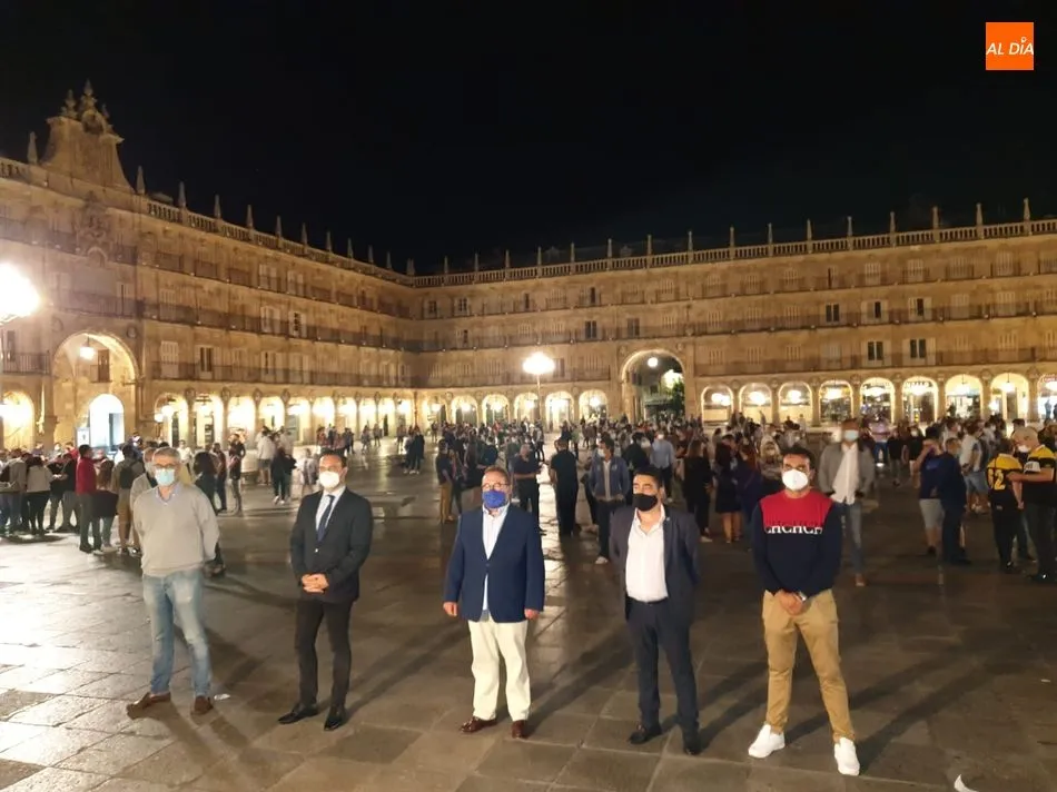 La Plaza Mayor ha acogido la concentración, convocada por la Asociación de Empresarios de Hostelería de Salamanca y Provincia y que ha contado con la presencia, entre otros, del presidente de la Confederación Empresarial de Hostelería de España