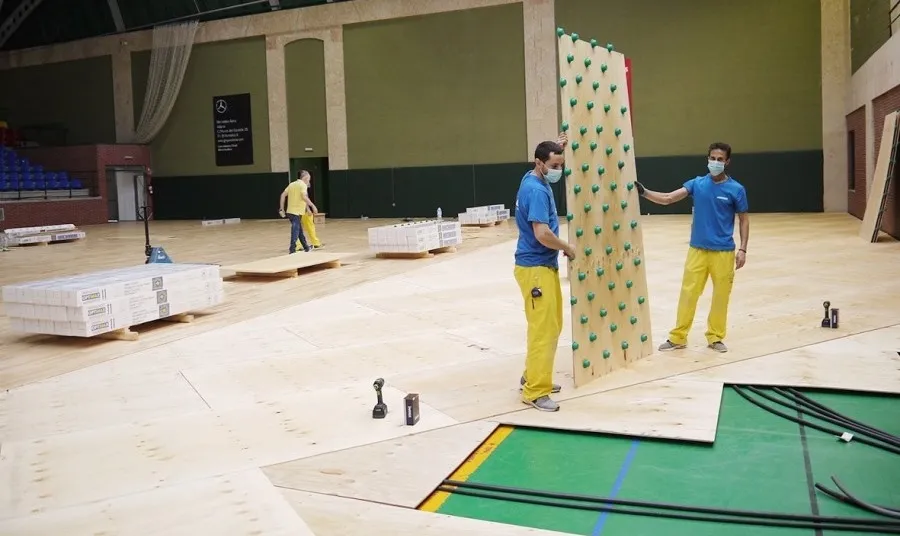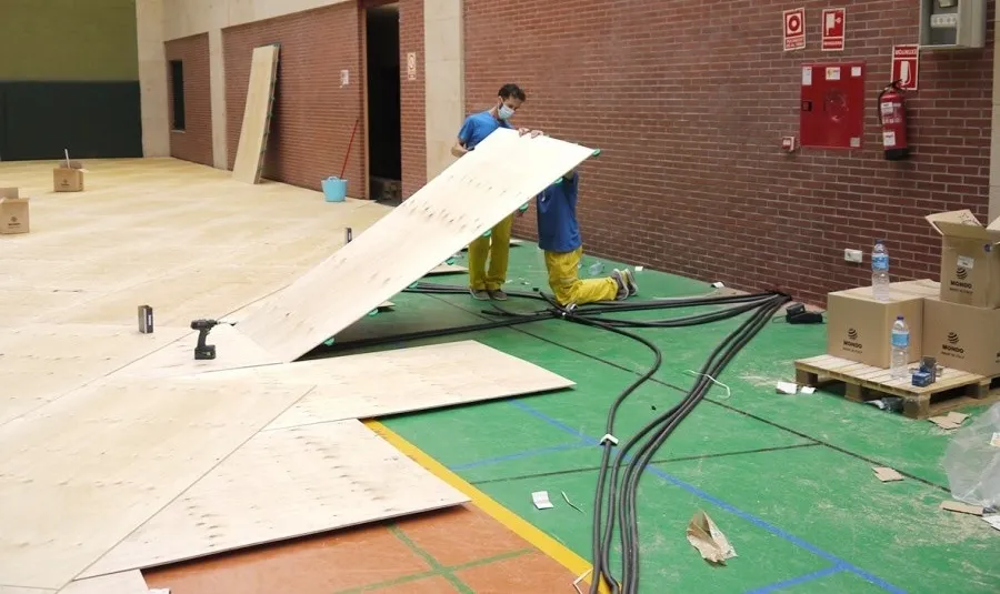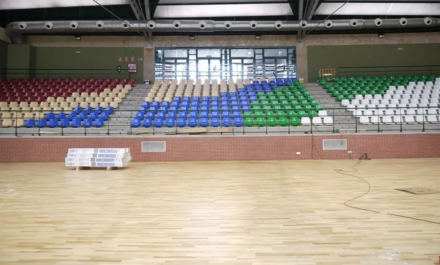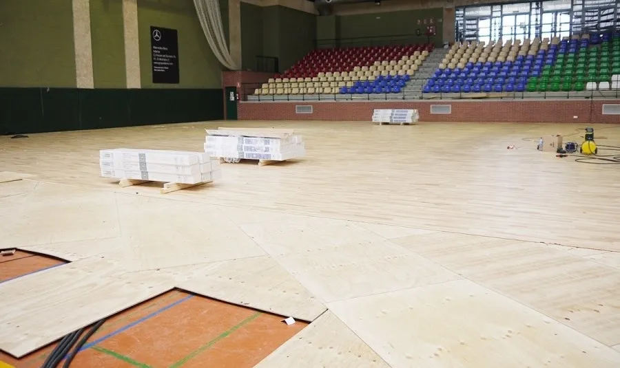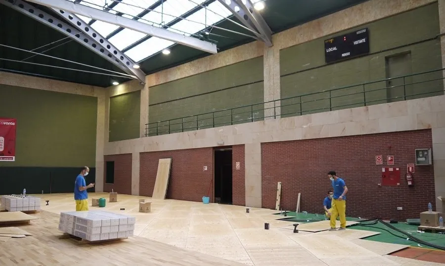 Se está montando suelo de madera certificado por FIBA, gradas extensibles y marcadores electrónicos de led que permitirán dar mayor información