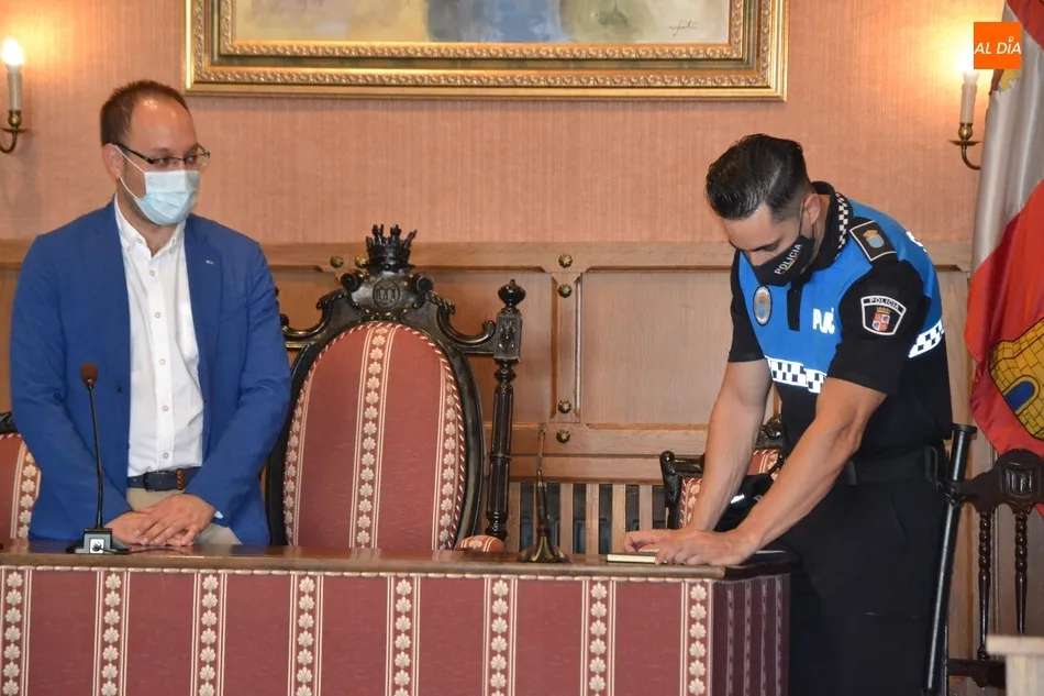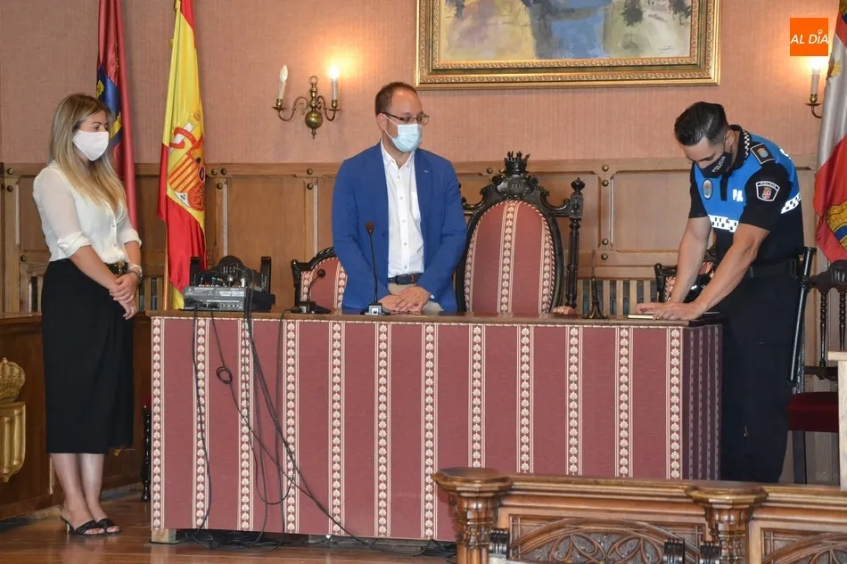 Una vez completada la formación en la Academia, así como el preceptivo período de prácticas en el seno de la Policía Local, el agente ha podido tomar posesión (consistente en la jura o promesa de su plaza, y la firma de los papeles oportunos), en un acto en el que estuvo acompañado por varios familiares, así como por otros miembros de la Policía Local, con quienes se sacó una foto al concluir el acto, presidido por el alcalde Marcos Iglesias. Asimismo, asistieron la delegada de Policía, Laura Vicente, y el secretario del Ayuntamiento, Carlos Hernández.