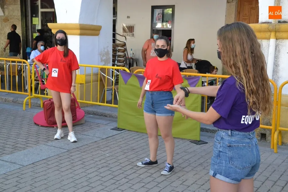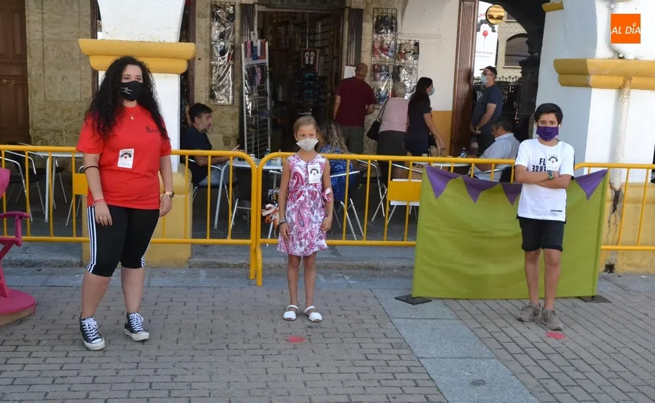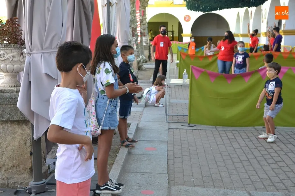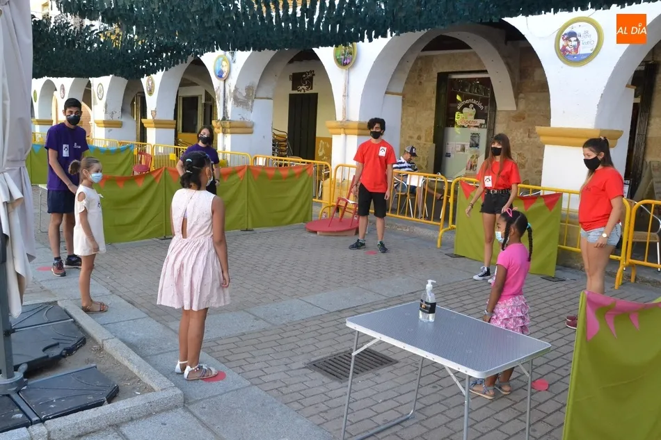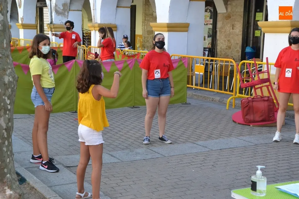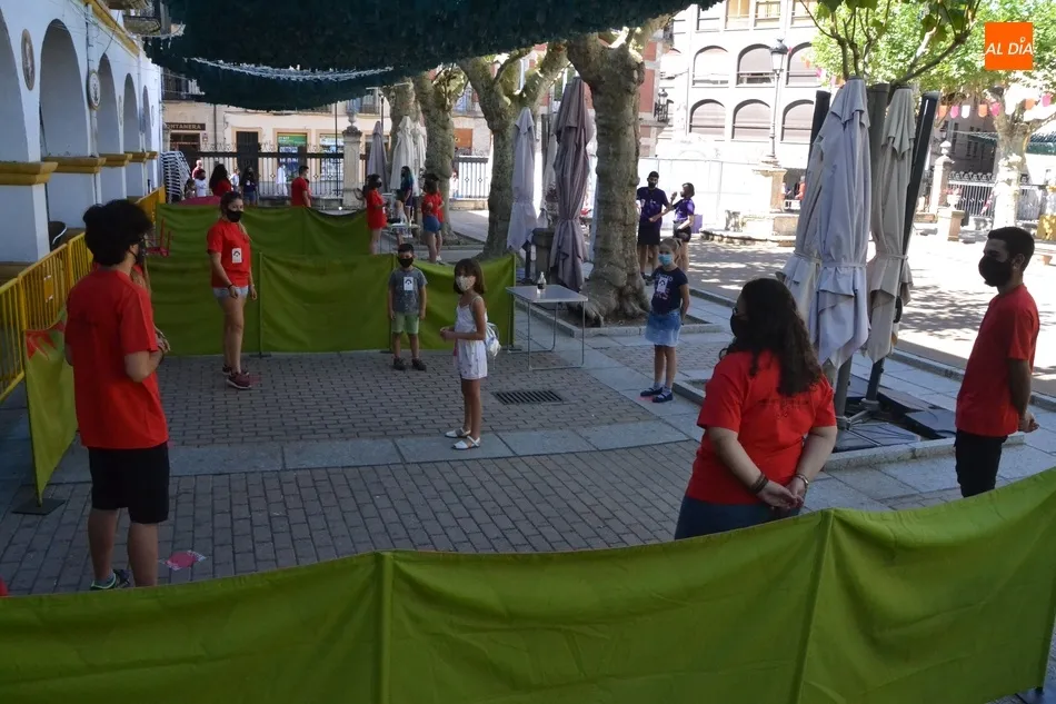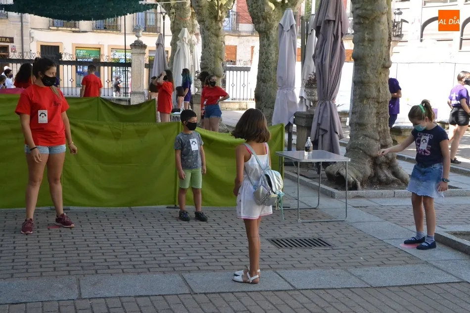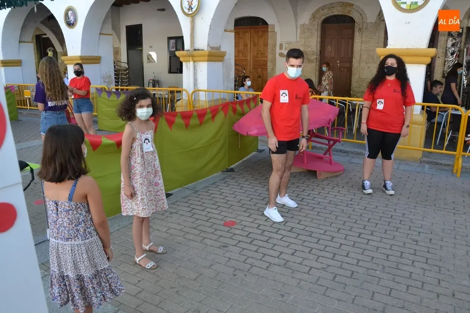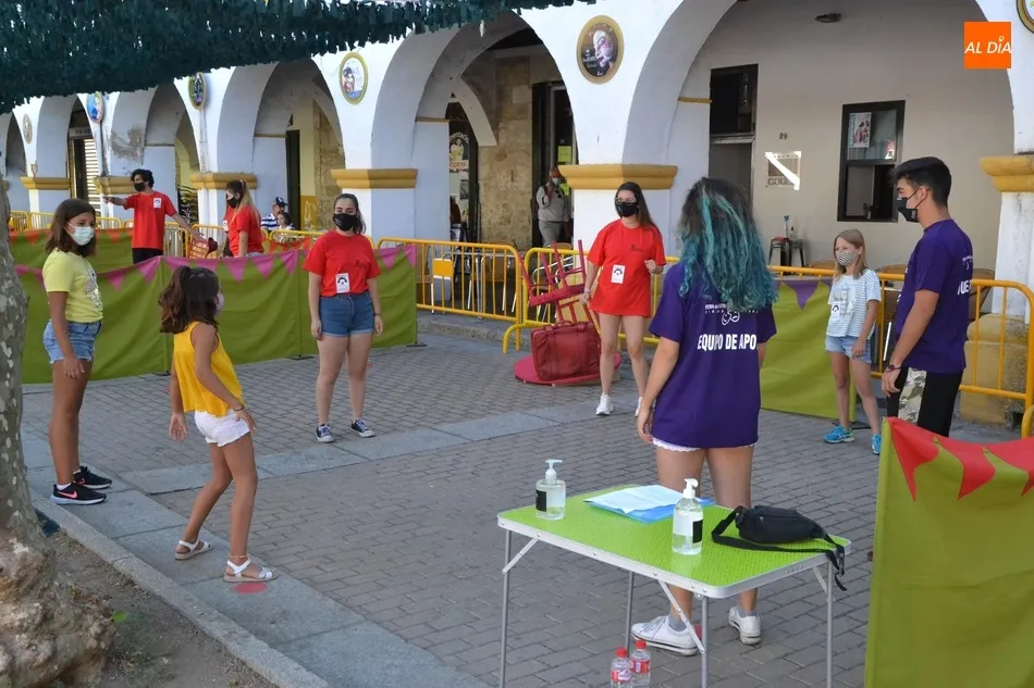 De este modo, las desinfecciones son continuas, tanto de los lugares de juego como de los propios participantes, con limpiezas constantes de manos con gel hidroalcohólico ofrecido por los monitores. Asimismo, como ya se ha explicado, este año los niños no se pueden mover libremente por la Plazuela del Buen Alcalde, sino que son guiados por monitores (mayores de 18 años, identificados con camiseta roja) e integrantes del Equipo de Apoyo (jóvenes de 16 y 17 años identificados con camiseta morada).