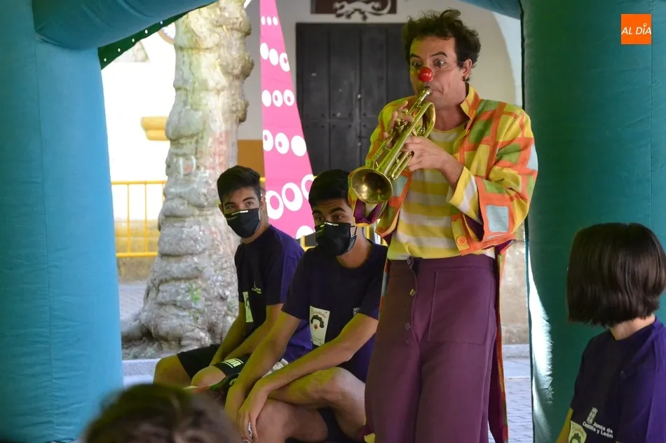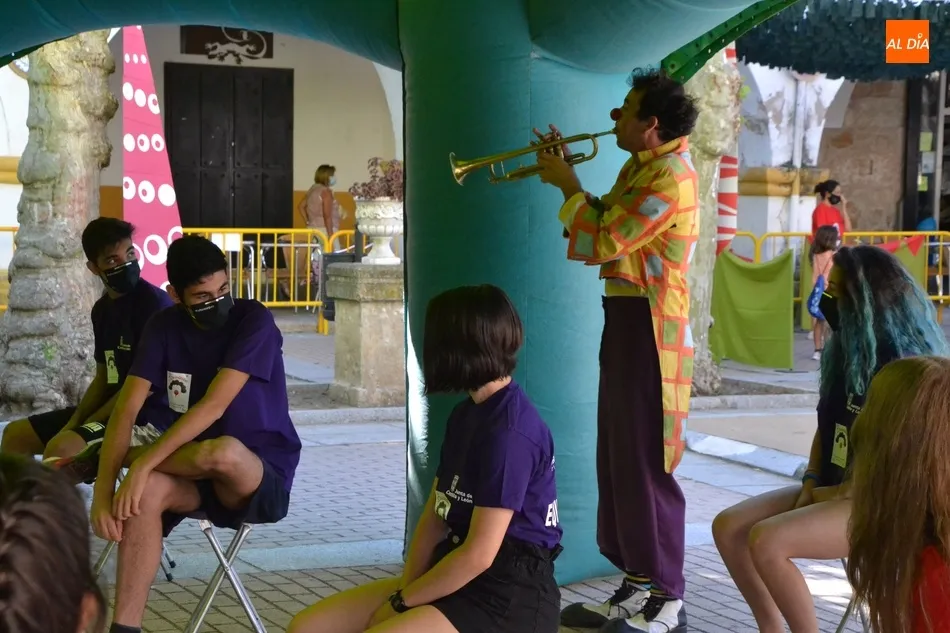 El otro lateral de la Plazuela, fuera de los soportales, contiene varios puntos de juego, todos ellos sin materiales, por los cuales los niños van pasando ordenadamente. Tanto los talleres como los juegos tienen como eje de un modo u otro el mundo del clown, que también marca las actuaciones de pequeño formato que incluye este año el Divierteatro.