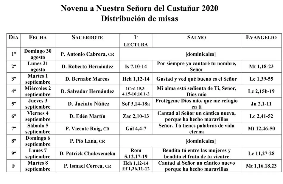En cuanto a los servicios habituales, entre el 30 de agosto y el 8 de septiembre, se mantendrá la misa diaria de las nueve de la mañana y los domingos, las de las 12 y 13 h., todas ellas sin novena y se permitirá la entrada de los fieles hasta completar el aforo permitido por las autoridades sanitarias y manteniendo la distancia social y todas las medidas de seguridad marcadas.