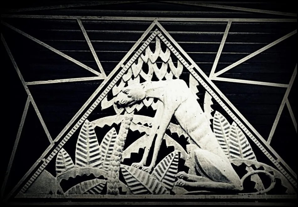 La ciudad provinciana, la ciudad adormecida, la ciudad apenas despertada a la modernidad, se asoma por las ventanas del edificio de Cordón a la selva virgen. Un guerrero casi desnudo se asemeja a un bailarín de ballet entre hojas y ramas puntiagudas. Es el triángulo de la geometría sin redondeces donde también, escuálida, desproporcionada, se asoma una leona. El cine de Hollywood se estiliza entre las líneas rectas de la rejería. No hay nada parecido en la ciudad letrada, la ciudad de piedra, la ciudad románica, renacentista, barroca. Es el triunfo de la modernidad y de la audacia. Por eso la gacela parece enmarcada en una joya Art Déco, los largos cuernos de un animalario exquisito sobre el tronco de la palmera delicadamente tallado. Los primeros planos de Amador Martín nos duplican la imagen y el cercano enfoque nos entrega los detalles: las manos de los guerreros, su pie de dedos doblados, el rotundo músculo de su pierna, las costillas marcadas.