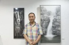 Pintar el agua es muy difícil, y más en blanco y negro, pero aquí quiero pintar la fuerza del agua. Un poema es de mi maestro Daisaku Ikeda y el otro de Francisco Acuyo. Yo buscaba una cascada, y salió un haikú que no es japonés, un haikú es tres, siete, tres?