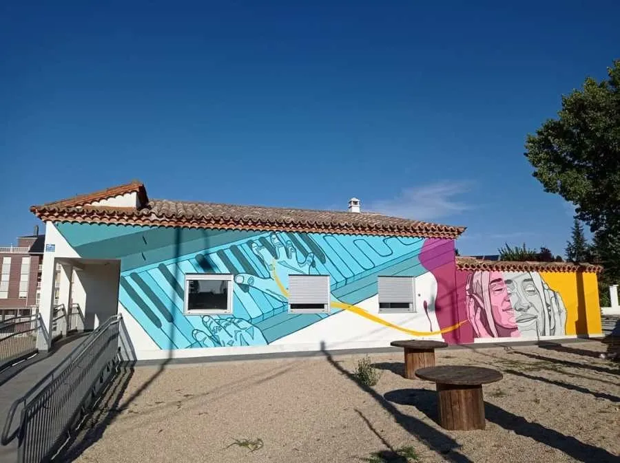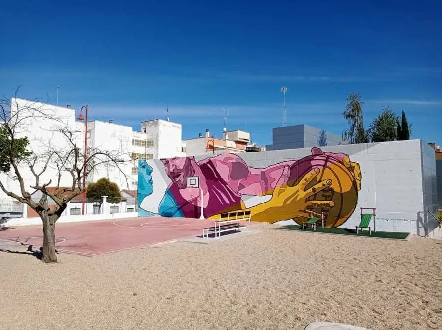Se trata de varias pinturas de gran formato que recubren la pared de la fachada del edificio principal, la pared de la cancha de baloncesto y la del depósito