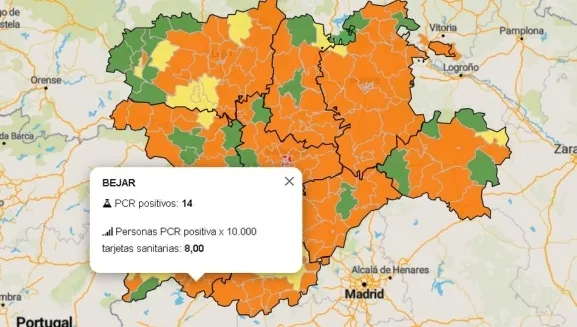 Cuando tan solo hace una semana que los niños se han incorporado a los colegios, la zona de salud de Béjar se pone en color naranja en el mapa de los rebrotes de la provincia de Salamanca y hoy los datos oficiales de la situación epidemiológica del coronavirus en Castilla y León marcan un ascenso del acumulado a 14 PCR positivos en los últimos siete días, 8 personas positivas por PCR en los últimos 7 días por cada 10.000 tarjetas sanitarias.