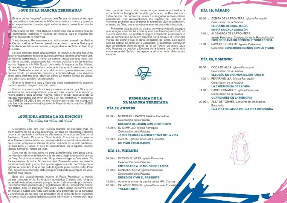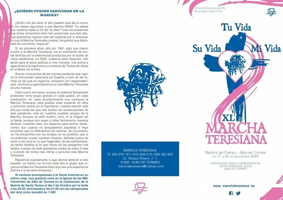Hoy comienza la Marcha Teresiana en Medina del Campo y mañana llega a la provincia de Salamanca, entrando por Cantalapiedra. Este año será realizada de forma virtual debido a la delicada situación provocada por el coronavirus. Por primera vez los peregrinos no caminarán físicamente, tras 39 ininterrumpidas caminatas desde Medina del Campo a Alba de Tormes, pasando por los lugares que recorrió la Santa abulense en su último viaje en vida.