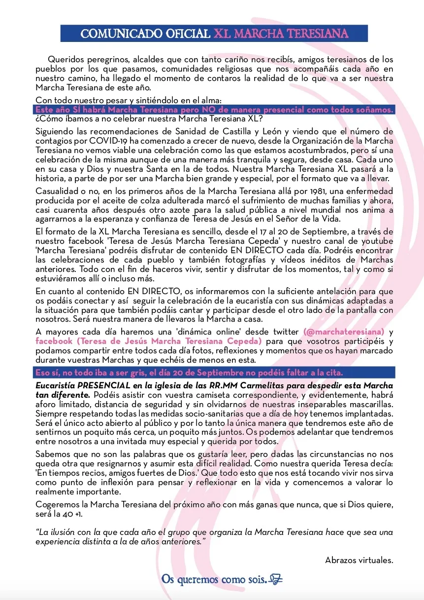 Los peregrinos y seguidores pueden sumarse a esta propuesta desde hoy a través del facebook ?Teresa de Jesús Marcha Teresiana Cepeda? y el canal youtube ?Marcha Teresiana?
