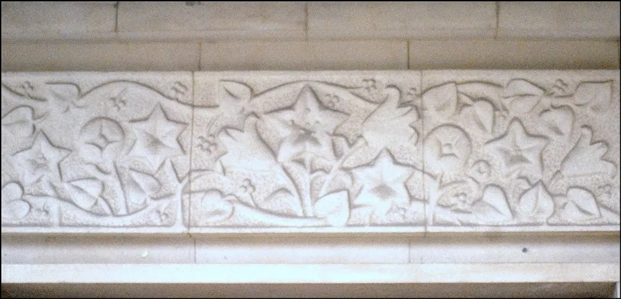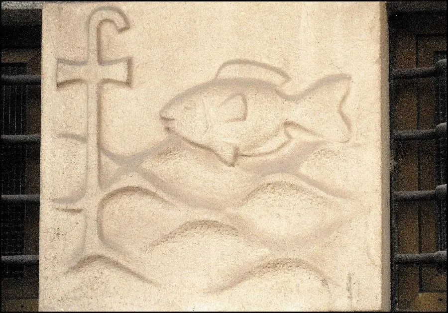 Humildes como caricias sobre la piedra, florecen las sencillas corolas y hojas, nadan los peces, se alza la tienda de campaña que representa el cuidado solidario y precario, la montaña se cubre de flores, símbolo de la cercanía de la tierra y el cielo, la unión que eleva. La cruz es de una desnudez extrema, las letras, de factura moderna, nos recuerdan los tiempos vivos, jóvenes, revolucionarios de una iglesia en comunión con la gente de la casa, de la calle, del barrio obrero de la periferia. Ejemplo admirable de trabajo estilizado, sencillo, que debió recordar al maestro Casillas su necesidad durante años de ser escayolista y decorador antes que escultor, artista. Hombre de barrio, cercano y laborioso ¿Cómo no salir de su mano el símbolo que adorna las puertas de su iglesia? Ejercicio humilde que pasa desapercibido en estos tiempos de paso raudo y que