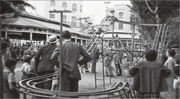 En este sentido destaca que estaban ?justo enfrente de Alvaro Gil, que se distingue perfectamente pues los dos edificios de esquina son los que existen en la actualidad?. La imagen muestra un ?curioso el aparato para probar la fuerza, en el que se empujaba el cajón y si salvaba la rampa inicial, luego ya caía por gravedad. Detrás los eternos coches de choque y unos soldados que parece que van a divertirse un rato?.