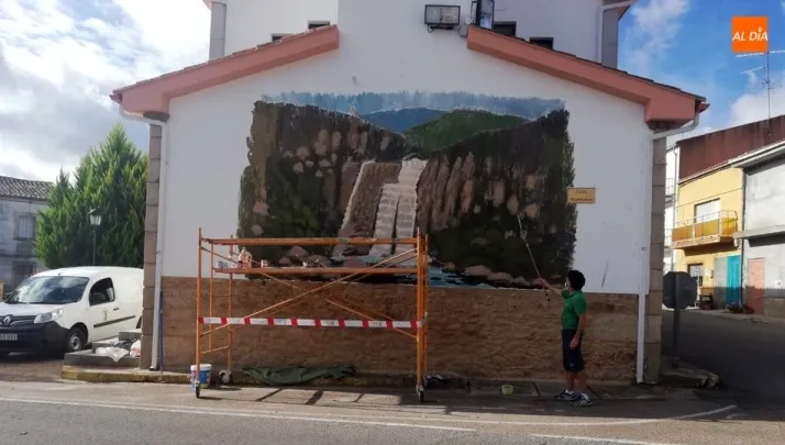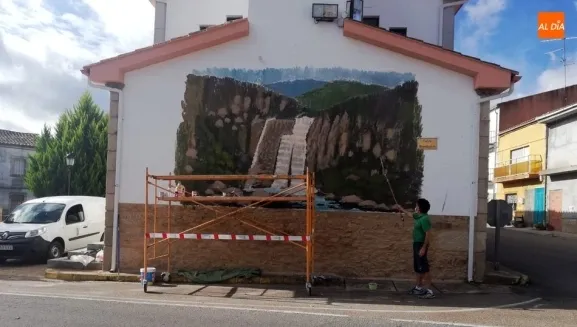 El pintor Juan Andrés Hernández plasma sobre una de las fachadas ubicadas en el centro del casco urbano la imagen más famosa del Parque Natural Arribes