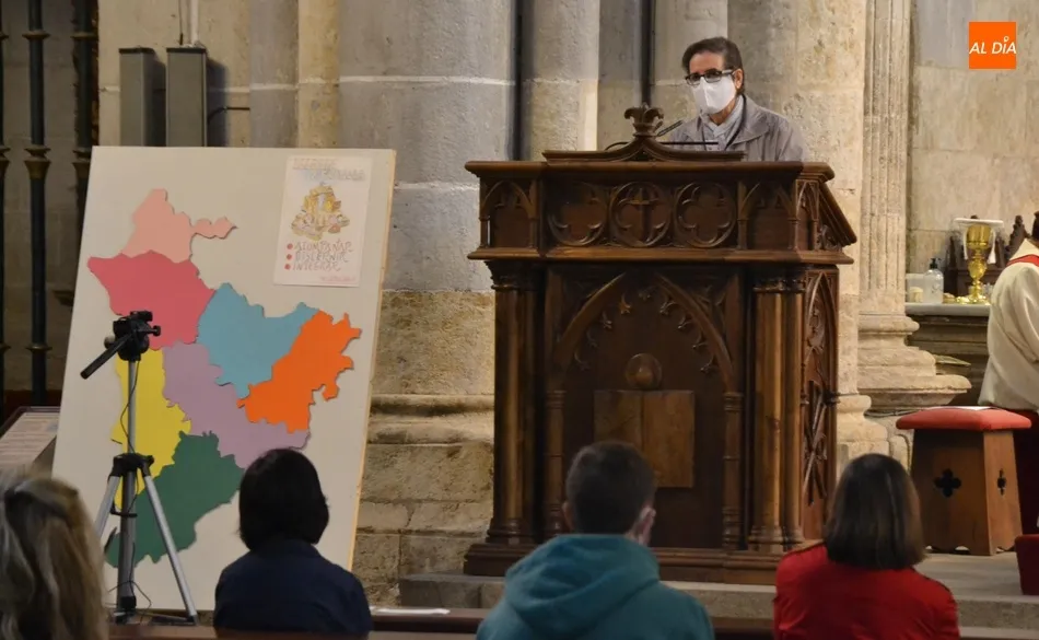 Tras un pequeño descanso, la segunda parte de la mañana fue una Eucaristía presidida por el Administrador Apostólico de la Diócesis de Ciudad Rodrigo, Jesús García Burillo, quién estuvo acompañado en el presbiterio de unos cuantos sacerdotes. Durante esta misa fue protagonista una familia mirobrigense al completo, que participó en el recorrido inicial hacia el altar, donde colocaron, junto al mapa de los 7 arciprestazgos diocesanos, el cartel del Curso Pastoral.